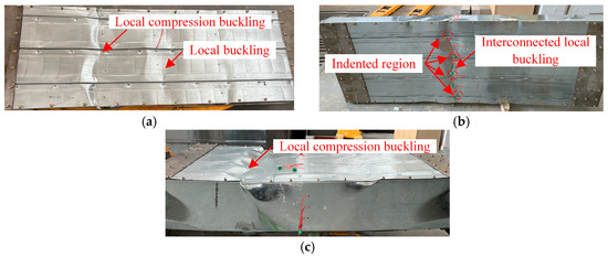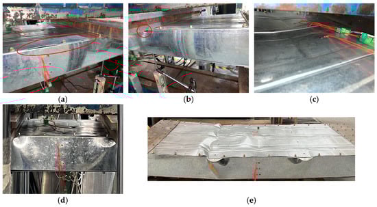 In the bearing capacity test of FMSPs, taking OFW-2-100-7 as an example, the test phenomena were described to illustrate the failure process in detail. At the force control loading stage, the specimen remained in an elastic state and no buckling occurred. At the displacement control loading stage, the free edge of the cell at the midspan started to bulge (corresponding load F = 12.1 kN), as shown in Figure 9a. Local compression deformation appeared in the loading location (corresponding load F = 15.8 kN). The lower free edge of the loading location experienced significant deformation due to the compression of the wooden block, resulting in an overestimation of the corresponding LVDT reading, as shown in Figure 9b. The upper free edge of the cell at midspan also began to bulge (corresponding load F = 19.8 kN). Distinct local buckling occurred, which was caused by the development of bulging in the upper free edge (corresponding load F = 26.2 kN), as shown in Figure 9c. Subsequently, the load reached the capacity (corresponding load F = 29.8 kN), and significant local buckling occurred in the upper flange at the midspan, but the indented regions did not separate or exhibit interconnected local buckling, as shown in Figure 9d. As the displacement further increased, the specimen gradually lost its bearing capacity, and the indented region began to separate. The ultimate failure mode involved local buckling of the upper flange and the web at the midspan, accompanied by some local compression deformation of the loading location, as shown in Figure 9e.