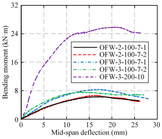As shown in Figure 11, it could be observed that the curves exhibited similar trends, divided into four stages: linear stage, nonlinear stage, peak load, and descent stage. At the initial loading stage, the bending moment–deflection curves showed a nearly linear relationship, with minor variations in stiffness among the specimens. When the load reached approximately 40% of the bearing capacity, the curves displayed nonlinear behavior until reaching the peak load. Subsequently, the curves exhibited a nonlinear descent with increasing deflection, ultimately leading to specimen failure. Near the peak load, the specimen exhibited significant deflection increase with small load changes. It was noted that before reaching the peak load, the curve of OFW-3-200-10 exhibited fluctuations due to the loosening of the end self-drilling screws and an increase in the gap between the end channel steel and the panel.