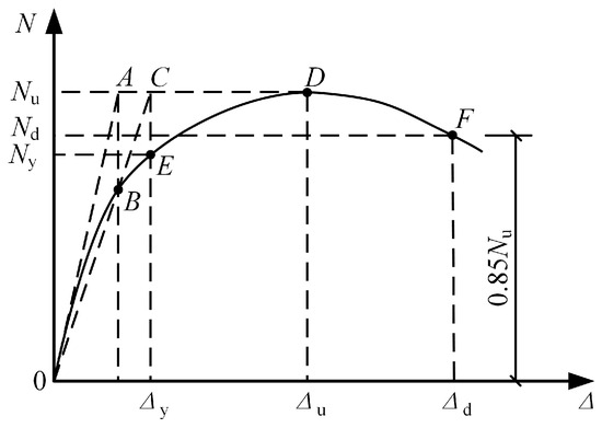 To evaluate the ductility performance of FMSPs, the ductility coefficient μ was calculated for each specimen using Equation (1), where Δd represents the displacement on the descending branch of the curve corresponding to 85% of the peak load Nu (i.e., Nd), and Δy denotes the displacement associated with the yield load Ny, determined according to the method illustrated in Figure 12. As summarized in Table 4, the calculated ductility coefficients exceeded 1.86, indicating that the FMSP specimens exhibit satisfactory ductility.