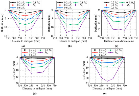 The deflection distribution of each specimen along the span at different load stages is shown in Figure 13. At the early stage of loading, the deflection was relatively small. When the load reached approximately 40% of bearing capacity, the deflection increased rapidly until the peak load.