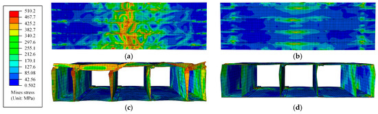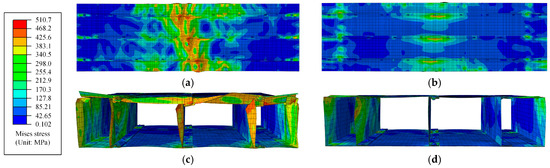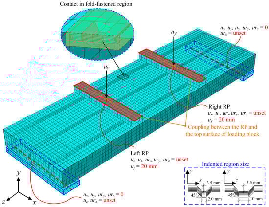 The refined FEMs were established by using ABAQUS 6.14. The geometric model was mainly composed of the FMSP, the end channel steel, the loading block, the bearing block, and the inner wooden block, as shown in Figure 14. Considering that the thickness of the steel plate was much smaller than the overall structural dimensions, and the stress in the thickness direction could be ignored, the S4R shell element was selected, which was defined with five integration points through the thickness and capable of accommodating shear deformation along that direction [51,52,53,54]. To better obtain the stress and deformation of the fold-fastened region, the mesh refinement was carried out, and the local mesh size was taken as 5 mm (along the x-axis), as shown in Figure 15.