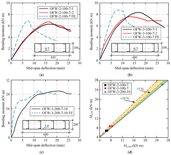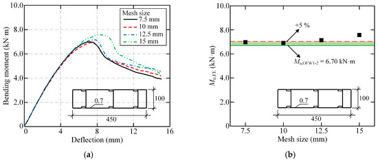 Taking OFW-2-100-7-2 as an example, four different overall mesh sizes of 7.5, 10, 12.5, and 15 mm were selected. The corresponding bending moment–deflection curves are presented in Figure 16a. It could be drawn that the initial stiffness and variation trend of each curve were consistent. When the overall mesh size was greater than 10 mm, the bearing capacity was significantly affected. When the overall mesh size was not more than 10 mm, the bearing capacity was rarely affected by the change in mesh size, and the error between the numerical and experimental results of OFW-2-100-7-2 was within ±5%, as shown in Figure 16b. Therefore, it was considered that the numerical results were convergent with a mesh size of not more than 10 mm. To balance the computational efficiency and accuracy, 10 mm was reasonably selected as the overall mesh size.