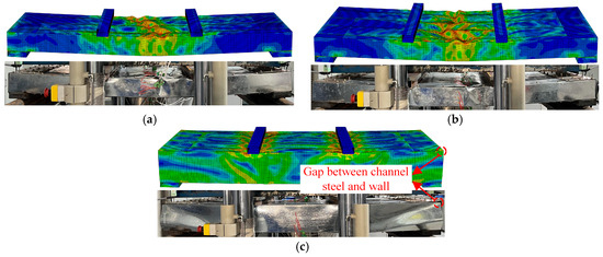 Referring to existing research, two-stage loading was adopted in the test [48,49]. Initially, force control loading was utilized until the load reached 1/3 of the estimated bearing capacity, with a loading rate of 2 kN/min. Subsequently, the loading mode was changed to the displacement control, maintaining a loading rate of 0.5 mm/min, until the specimen was damaged or the loading beam was about to touch the specimen.