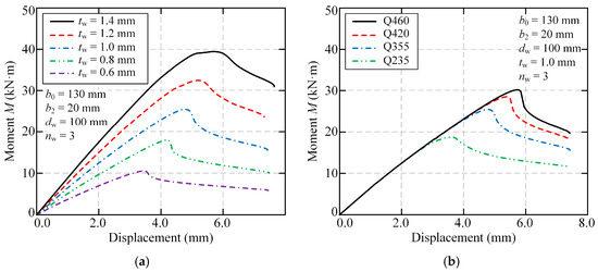The effects of steel plate thickness tw and steel strength fy on the flexural behavior of FMSPs are described in Figure 23. In Figure 23a, it could be found that as the steel plate thickness increased, the initial stiffness increased significantly. In addition, when the steel plate thickness increased from 0.6 mm to 0.8, 1.0, 1.2, and 1.4 mm, the ultimate flexural capacity increased by 70.33%, 140.93%, 206.72%, and 272.57%, respectively. The enhanced performance with increasing steel plate thickness tw is attributed to two fundamental mechanical principles: (1) improved local buckling resistance due to reduced width-to-thickness ratios, allowing sections to further utilize their material capacity, and (2) increased sectional modulus that directly enhances moment capacity. Therefore, in the practical design of FMSPs, choosing thicker steel plates could yield favorable mechanical performance.