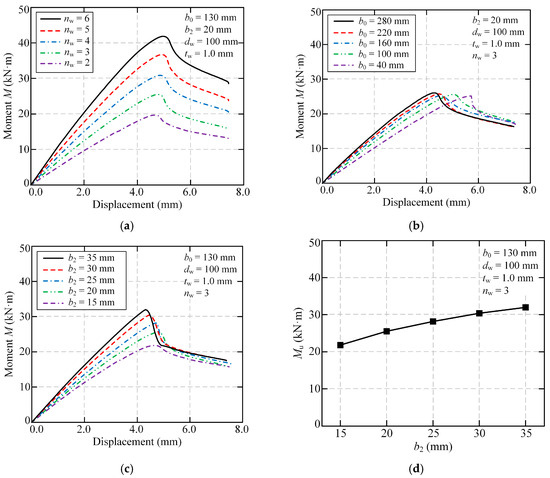 The panel width was determined by the cell number nw, the plate width b0, and the width b2 of fold-fastened regions. From Figure 24a, it could be drawn that when the cell number np increased from 2 to 6, the increments of ultimate flexural capacity were 5.85, 11.20, 17.60, and 22.21 kN·m, respectively. Therefore, it could be concluded that when nw increased, the ultimate flexural capacity increased linearly. The linear relationship between cell number nw and flexural capacity stems from the direct proportionality between additional cells and sectional moment of inertia.