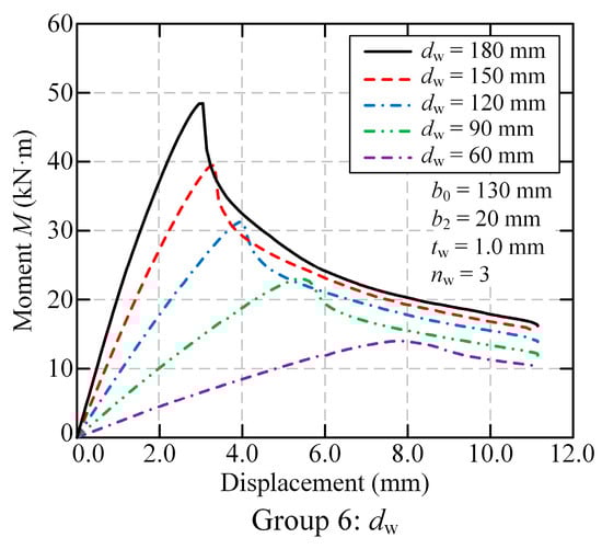 As shown in Figure 25, as the panel thickness dw increased from 60 mm by 50%, 100%, 150%, and 200% to 90, 120, 150, and 180 mm, the ultimate flexural capacity increased by 64.11%, 123.16%, 181.56%, and 246.18%, respectively. The exceptional effectiveness of increasing panel thickness dw follows from the fundamental bending theory, where section modulus increases with the square of the section height. This mechanical principle explains why panel thickness enhancement provides an efficient means for improving flexural performance in FMSPs.