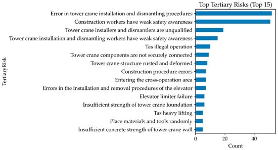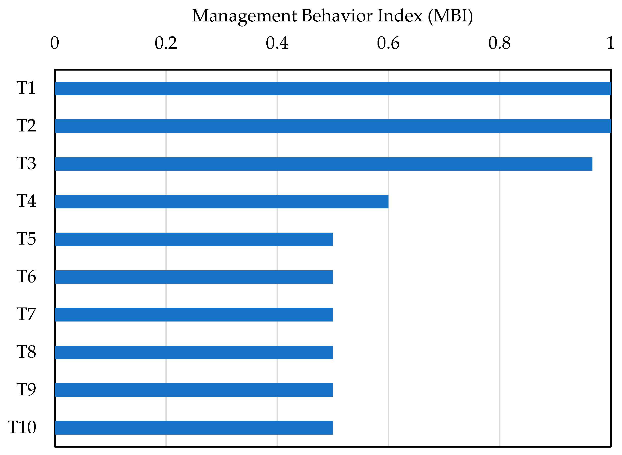 Figure 10. Top 10 Management Behavior Sub-Index (MBI) for Level 3 Risk (T1 = The signalman failed to properly secure the suspended object; T2 = Elevator operator’s violation of regulations; T3 = Tasman’s illegal operation; T4 = Signalman’s erroneous command; T5 = elevator overload; T6 = Signal workers have a weak sense of safety; T7 = Unqualified signal worker; T8 = Tower blind hanging; T9 = Tutor fatigue; T10 = Construction procedure error).