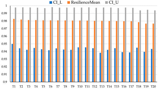 Figure 7. The top 20 ResilienceMean (T1 = Lifting path obstructed; T2 = Low-temperature brittle fracture of tower crane structure; T3 = Hook broken; T4 = Tower crane overload; T5 = Piling machine brake damaged; T6 = Materials and tools near the opening are scattered.; T7 = Tower crane hoisting rope breaks; T8 = Pump truck boom connection loose; T9 = The tower crane structure is tilted too much.; T10 = The overall steel platform has poor sealing performance; T11 = Thunderstorm; T12 = high temperature;T13 = Group tower operation;T14 = poor sealing of climbing scaffold; T15 = Tutor fatigue; T16 = Tower crane anti-disengagement device malfunction; T17 = Multiple three-dimensional cross-operation surfaces; T18 = Signalman’s erroneous command; T19 = There is a risk of objects falling from heights; T20 = Inadequate protection of the working environment).