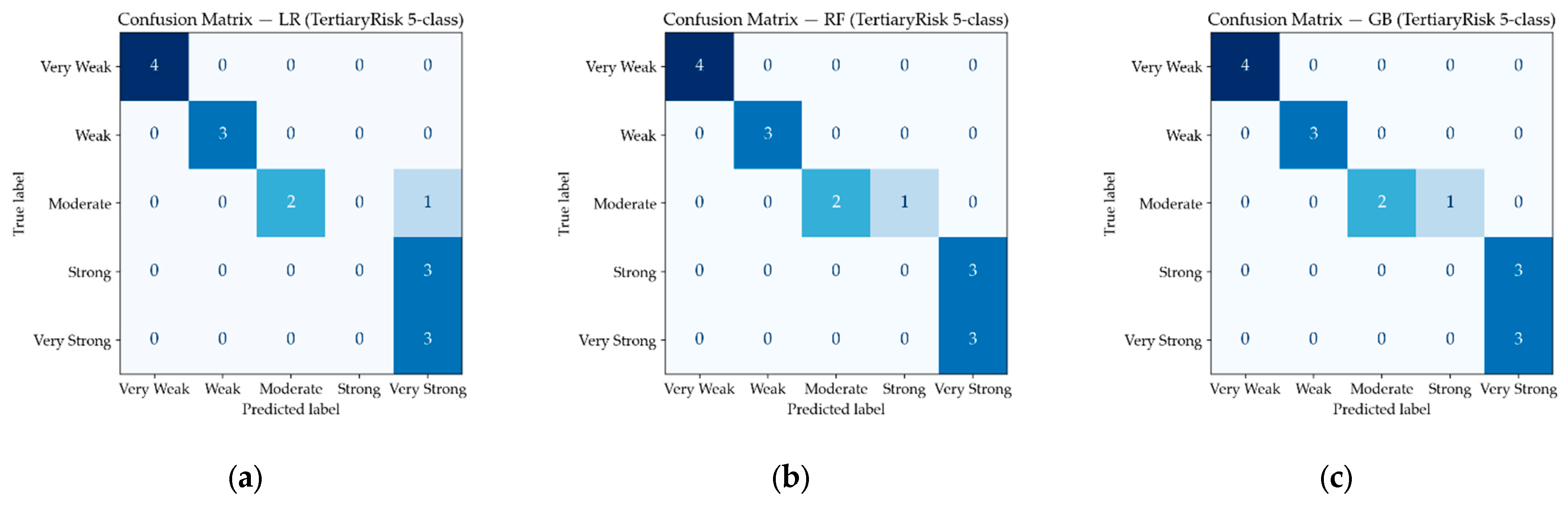 Figure 8. Confusion matrix: (a) LR, (b) RF, (c) GB.