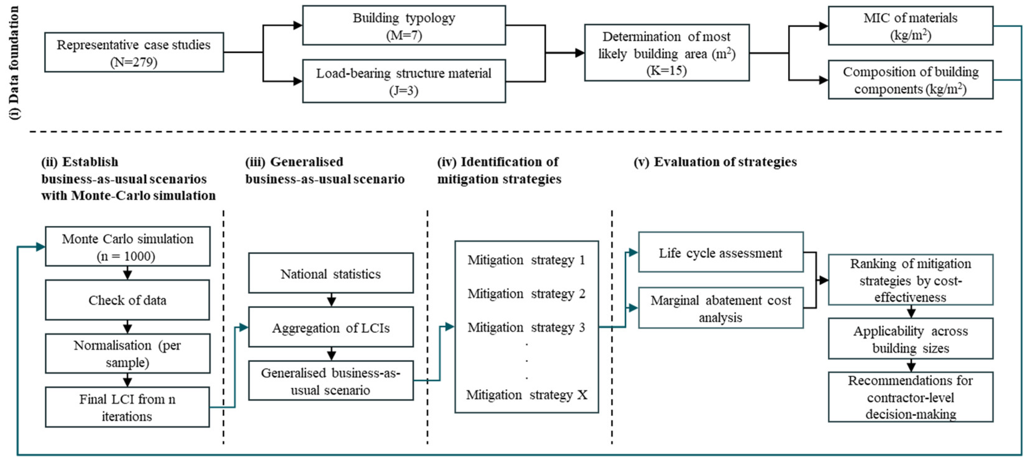 The MICs indicate the amount of total material input required in kilograms per unit of gross floor area [42] and serve as a key metric for assessing construction GHG emissions. The LCIs include material and energy flows associated with modules A4 and A5, forming the basis for the BAU scenario. The third step involves aggregating the individual LCIs using national construction statistics to create a generalised BAU scenario that reflects current building practices in Denmark. In the fourth step, 20 mitigation strategies are identified based on their potential to influence emissions from transport, waste, and energy use during construction. Finally, the mitigation strategies are evaluated through life cycle assessment and marginal abatement cost analysis. The results are used to rank the strategies by cost-effectiveness and assess their applicability across different building sizes, providing actionable insights for contractors and decision-makers.