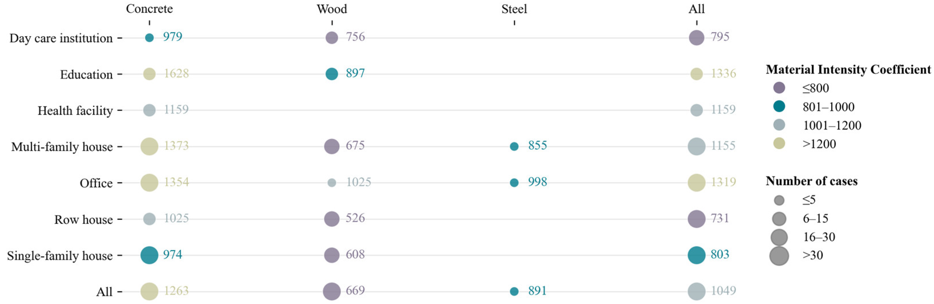 Figure 3. Average material intensity coefficients (MICs) in kg/m2 across case studies grouped by typology and building structure. Colour coding indicates MIC ranges, while the size of each circle reflects the number of case studies used to derive the average—larger circles represent typology-structure combinations with more data, enhancing confidence in the reported values.