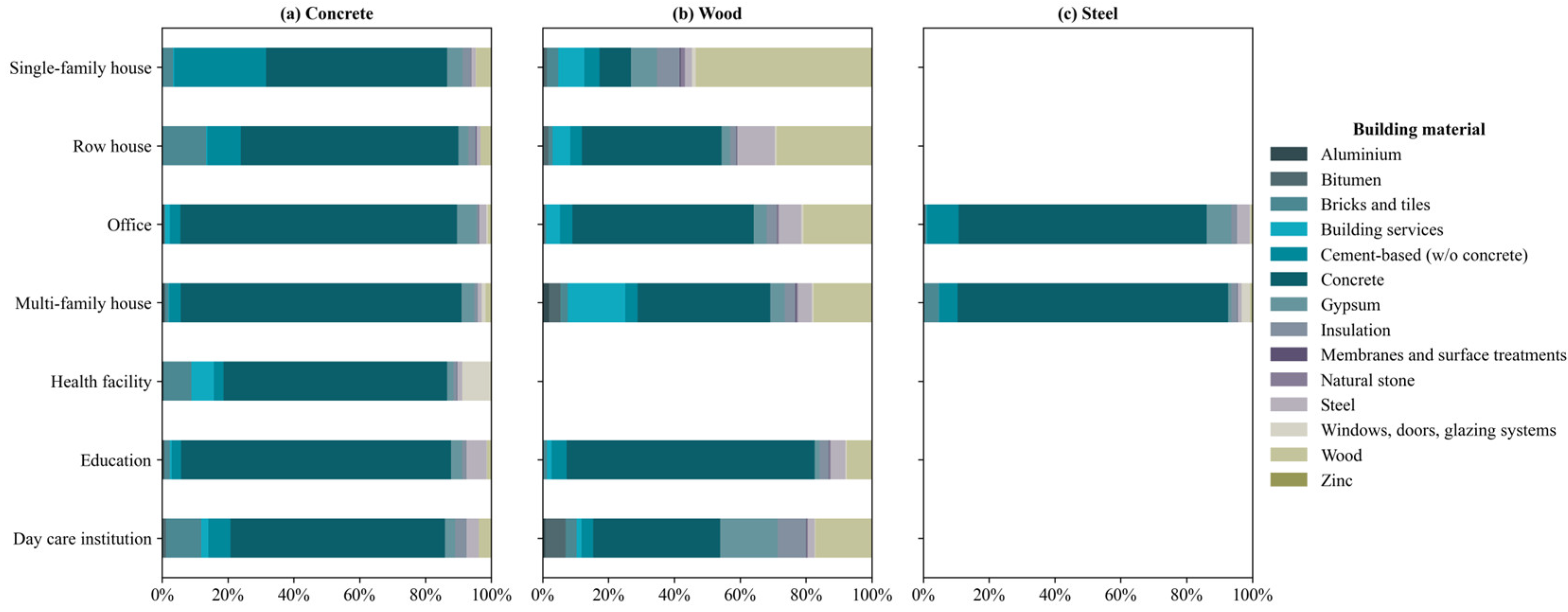 Figure 4. Material weight share of the 15 generated archetypes, grouped into seven building typologies and three primary structural materials: (a) Concrete, (b) Wood, and (c) Steel. Each bar represents the relative share of material groups used in construction.