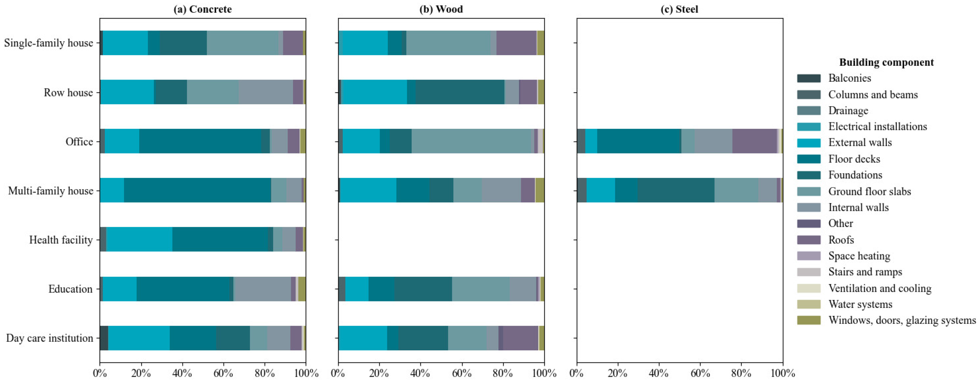 Figure 5. Building components’ weight share across the 15 generated archetypes, grouped into seven building typologies and three primary structural materials: (a) Concrete, (b) Wood, and (c) Steel. Each bar shows the relative share of components in the building.