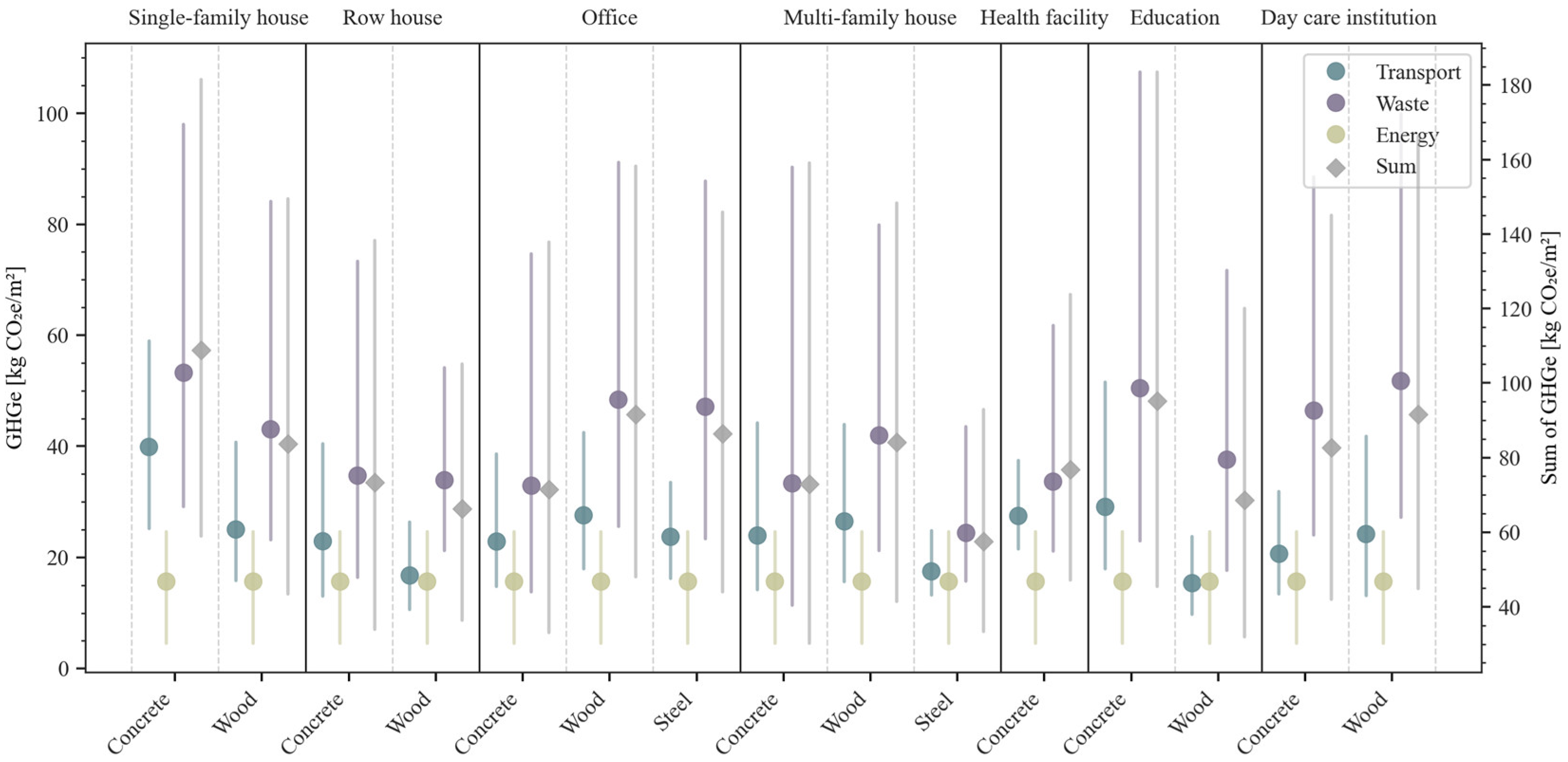 Figure 6. Greenhouse gas emissions (GHGe) per unit area for the business-as-usual (BAU) scenario for the 15 generated case studies. Coloured dots represent contributions to transport, waste, and energy, with error bars showing their minimum and maximum values. Diamonds indicate the total sum of emissions on a secondary y-axis.