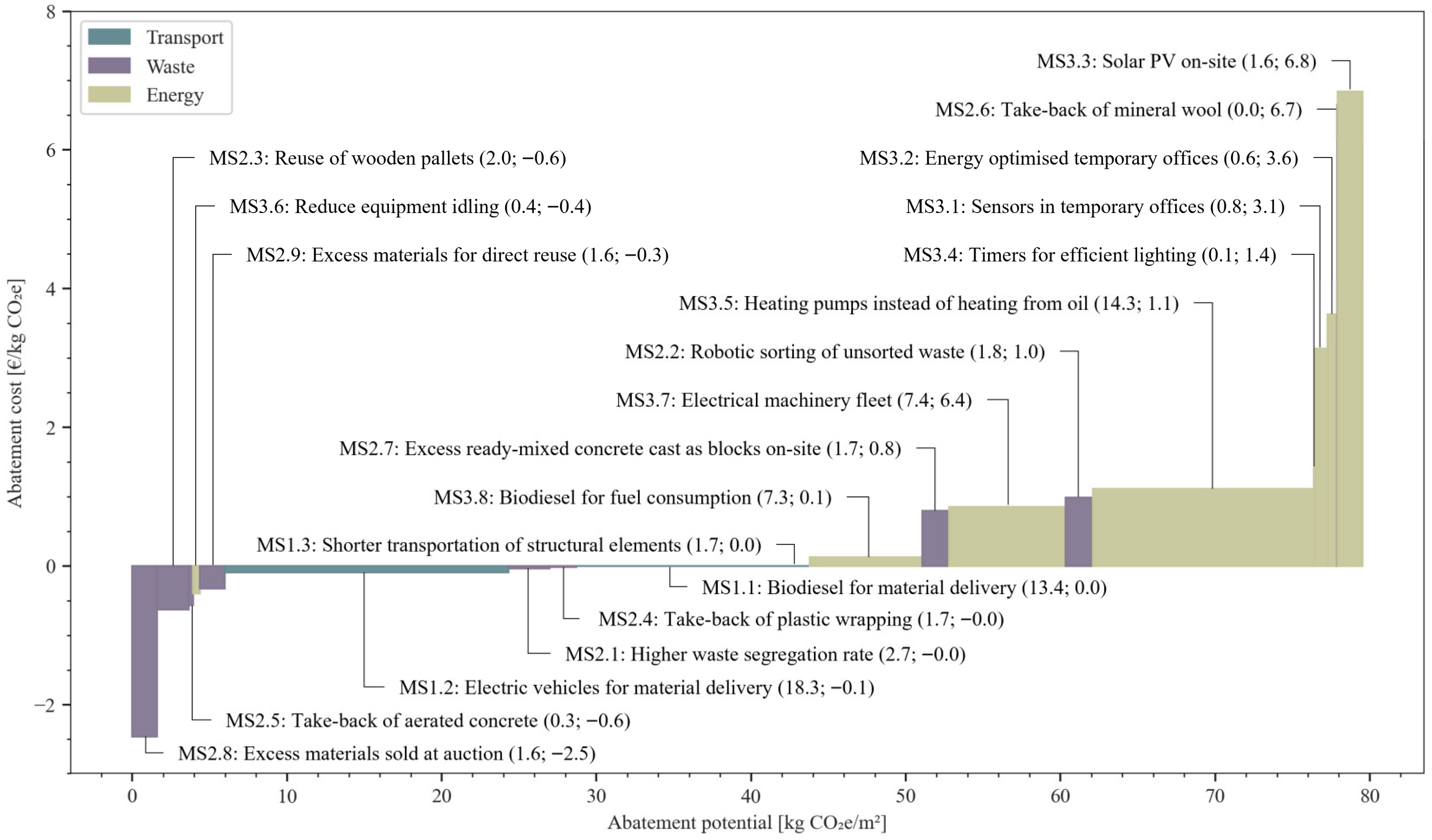 Figure 7. Marginal abatement cost curve (MACC) illustrates the cost-effectiveness and mitigation potential of 20 construction-phase mitigation strategies. Each bar represents a strategy, categorised by transport, waste, or energy, with the height indicating the abatement cost (€/kg CO2e) and the width representing the abatement potential (kg CO2e/m2). Strategies with negative costs indicate net savings, while positive values reflect additional investment per unit of emissions abated.