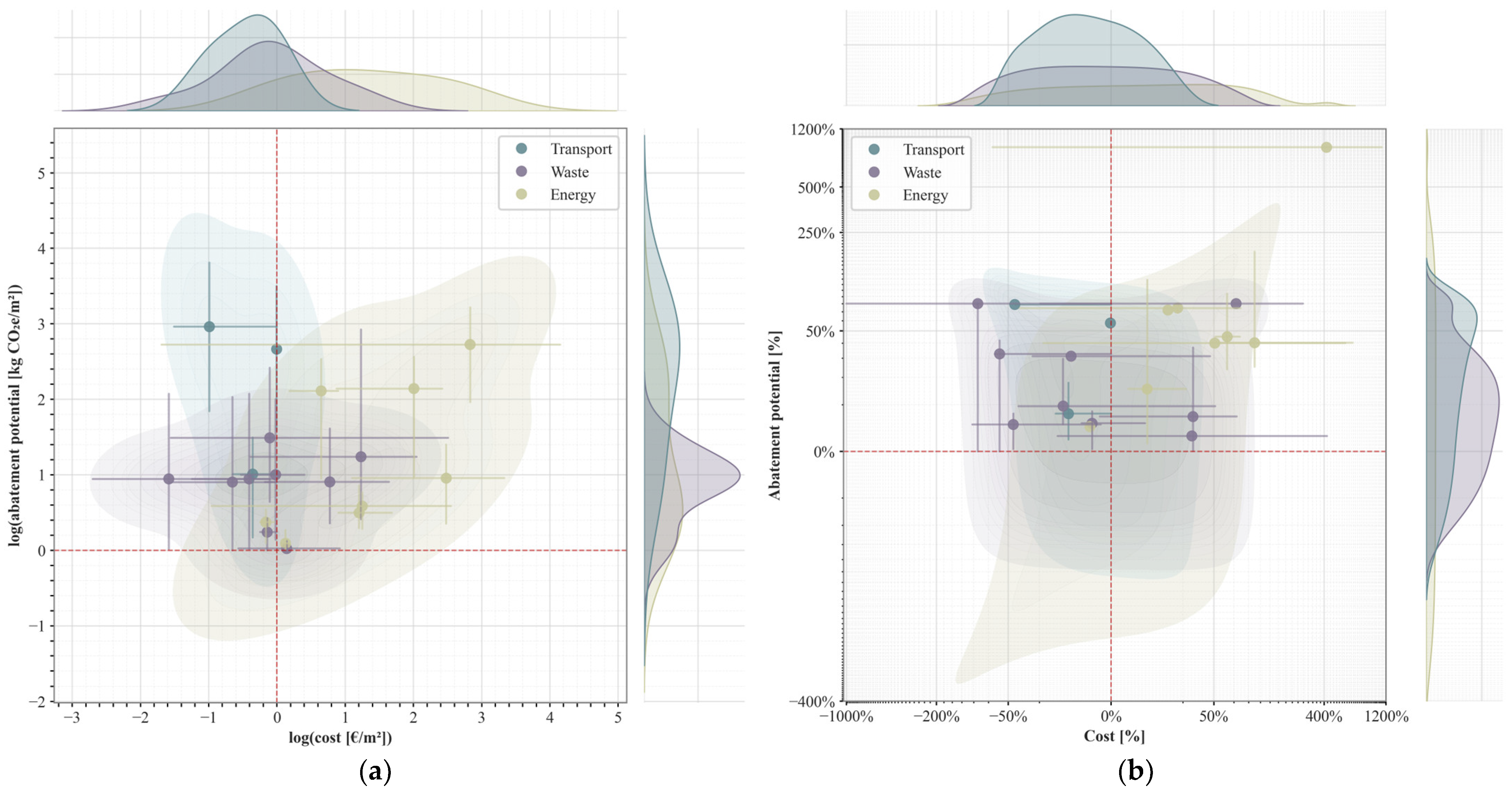Figure 8. Comparison of mitigation strategies in terms of cost and abatement potential. (a) Average cost in €/m2 versus average abatement potential in kg CO2e/m2 with both axes shown on a signed-log scale to capture negative, small, and large values. (b) Average cost versus abatement potential expressed as percentage change relative to the base scenario. Each point represents the average value for a strategy, while horizontal and vertical error bars indicate the minimum and maximum values, illustrating the uncertainty or range of outcomes. Colours correspond to the resource types: transport, waste, and energy.