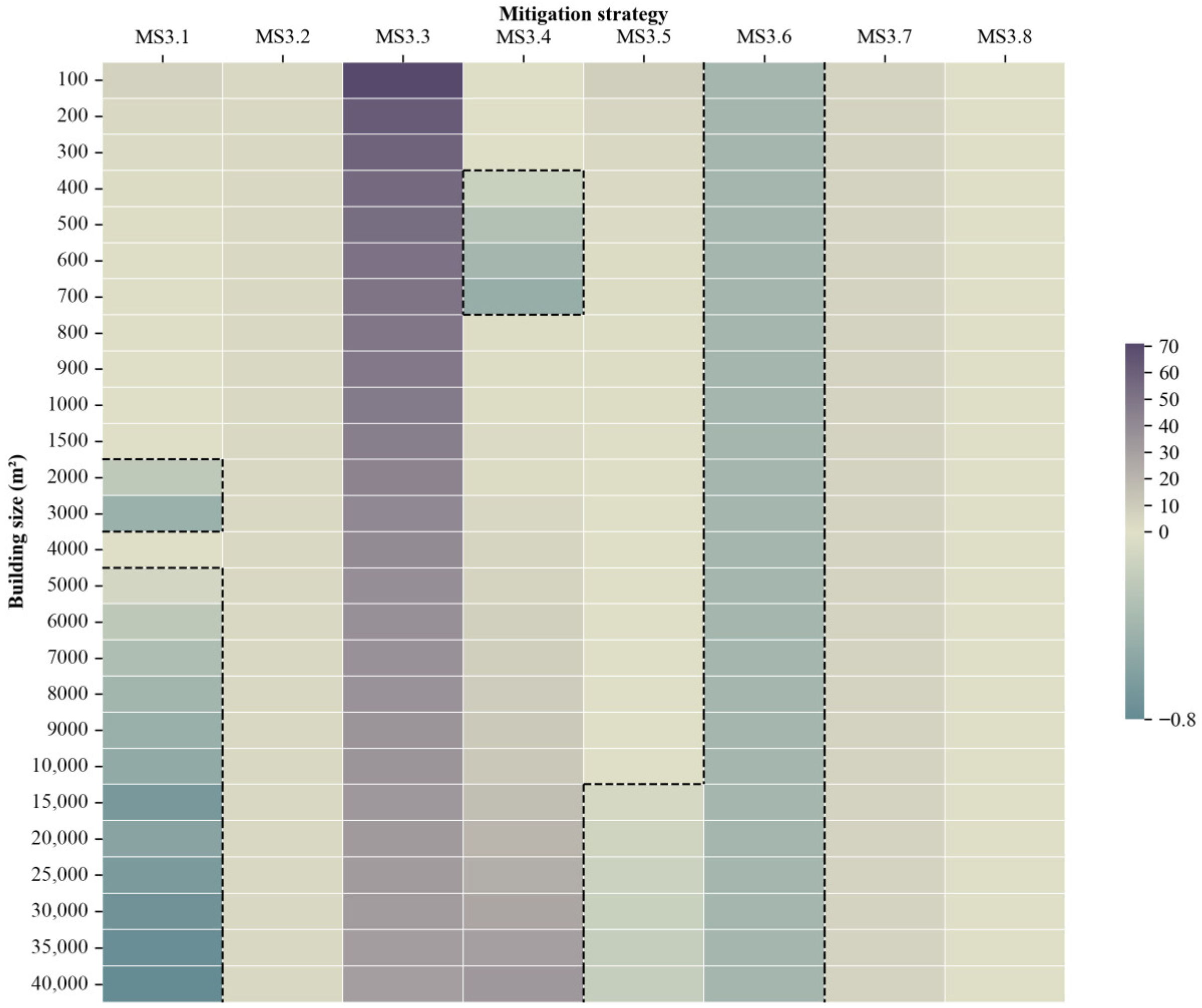 Figure 10. The impact of building size (m2) on marginal abatement costs (€/kg CO2e) for different energy mitigation strategies. A dashed line separates positive (investment) and negative (net benefit) values.