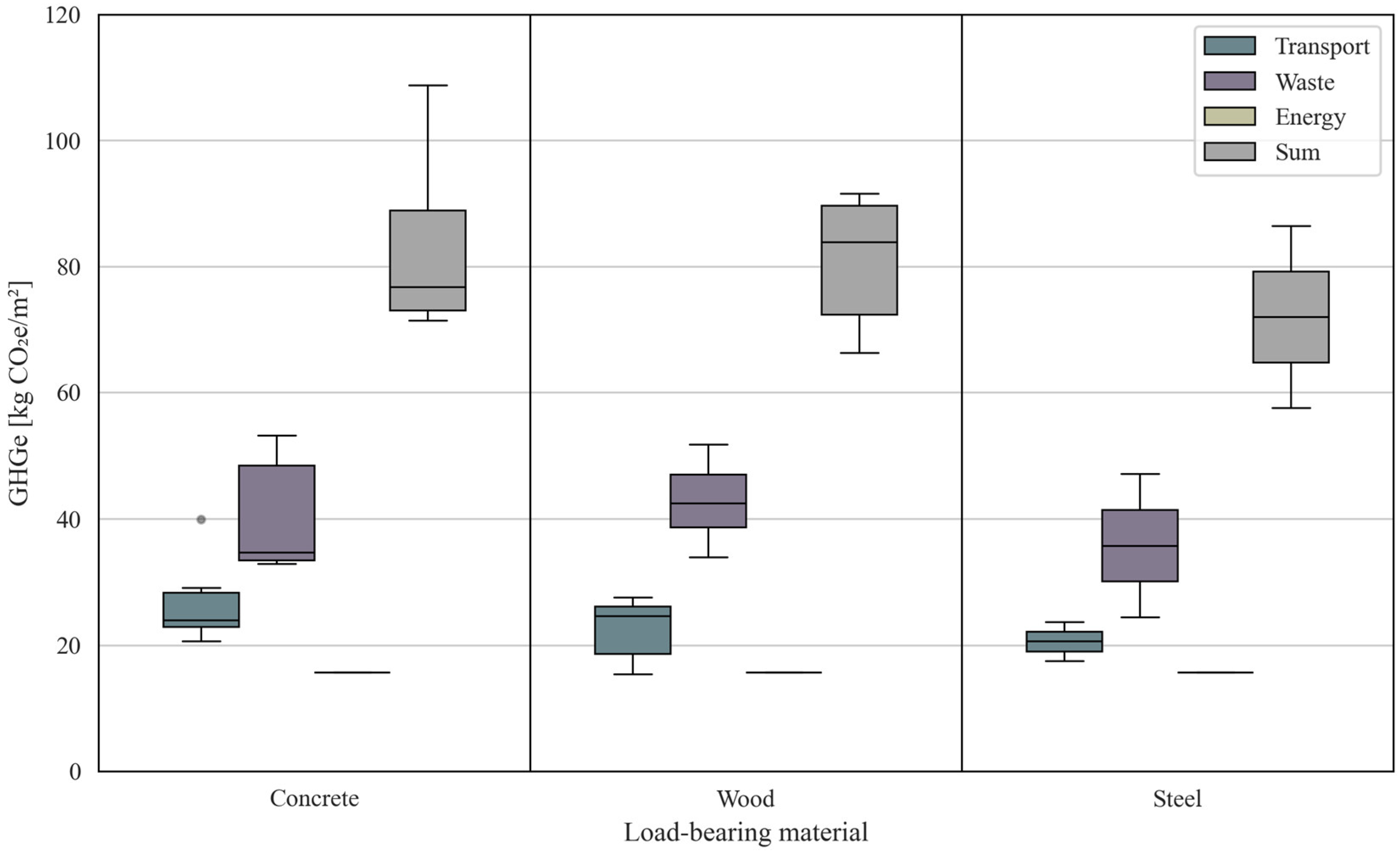 Energy consumption during construction was assumed to be linearly distributed over the considered time scope, as detailed time-resolved data were unavailable. Electricity and heat grid mixes were modelled according to the 2025 projection by the Danish Energy Agency. The total energy use was based on measured data for the construction process of 63 building projects constructed from 2014 to 2025, reported in Hasselsteen et al. [48]. The average electricity use was 49.6 kWh/m2 (range: 20.6–72.4 kWh/m2), heating use was 37.5 kWh/m2 (range: 16.1–63.1 kWh/m2), and fuel use was 2.9 L/m2 (range: 0.6–4.7 L/m2). These values provide a representative benchmark for typical projects and were used to define minimum and maximum boundaries for sensitivity analysis via the interquartile range. No distinction was made between electricity used for temporary offices, construction lighting, and electricity used for the remaining construction work. However, Seo et al. [49] estimated that 52.5% of the total electricity consumption in the construction phase was consumed by the temporary offices, followed by direct construction, lifting equipment, and common temporary work, and a Danish case study revealed that 15.7% of the total electricity consumption was used for construction lighting. Due to the lack of more representative data, these shares were applied to allocate electricity consumption internally.