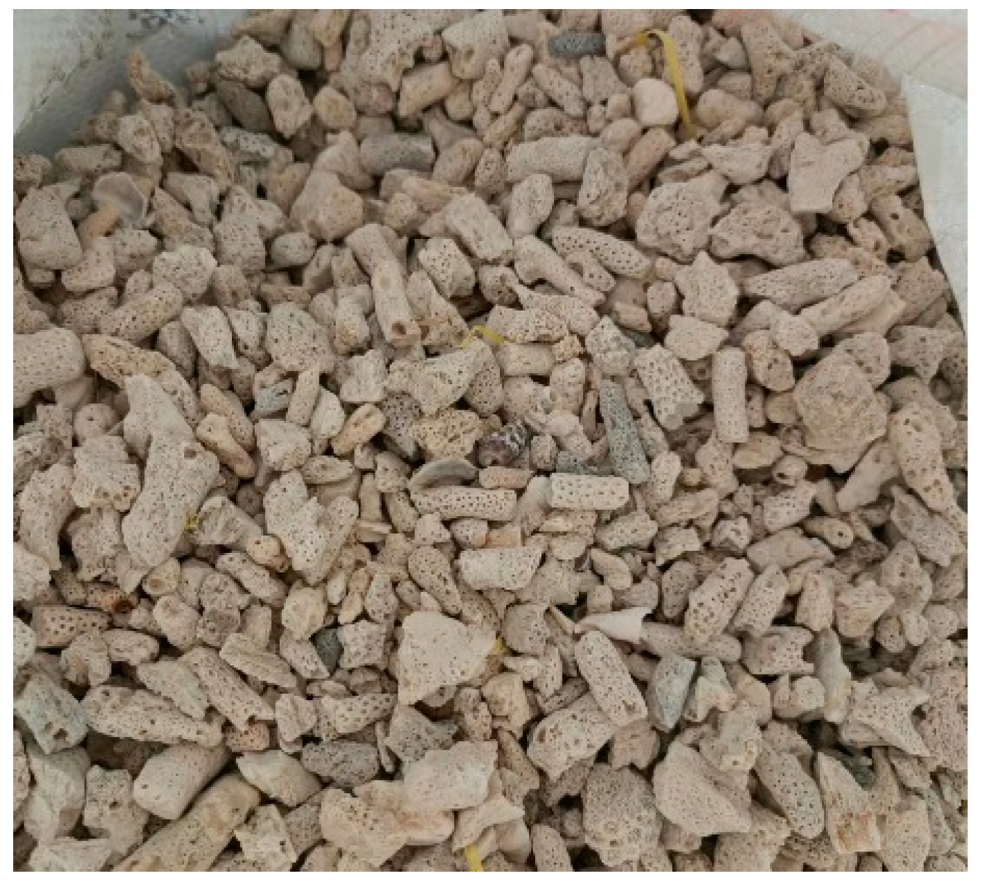 - Lyu, B.; Wang, A.; Zhang, Z.; Liu, K.; Xu, H.; Shi, L.; Sun, D. Coral aggregate concrete: Numerical description of physical, chemical and morphological properties of coral aggregate. Cem. Concr. Compos. 2019, 100, 25–34. [Google Scholar] [CrossRef]
