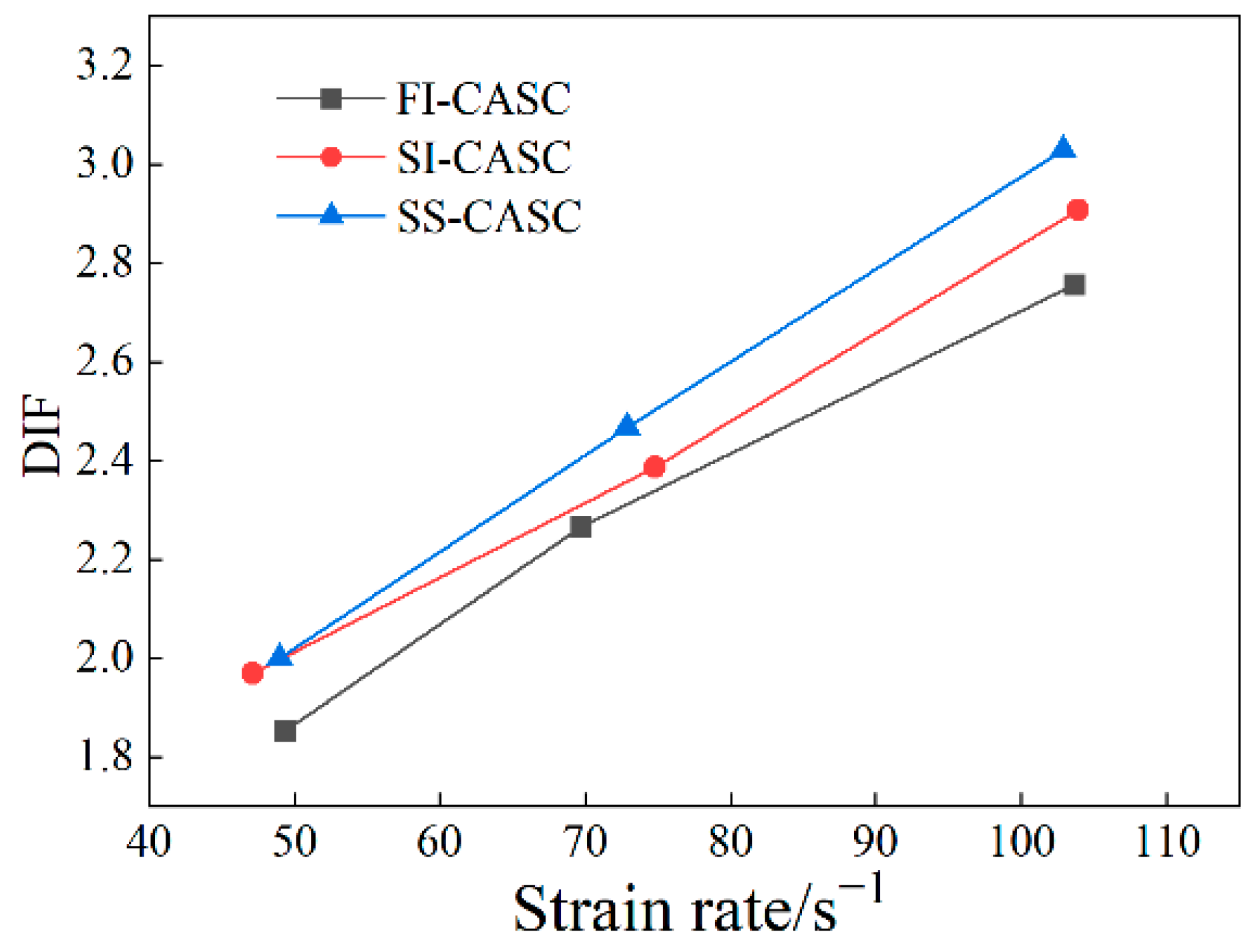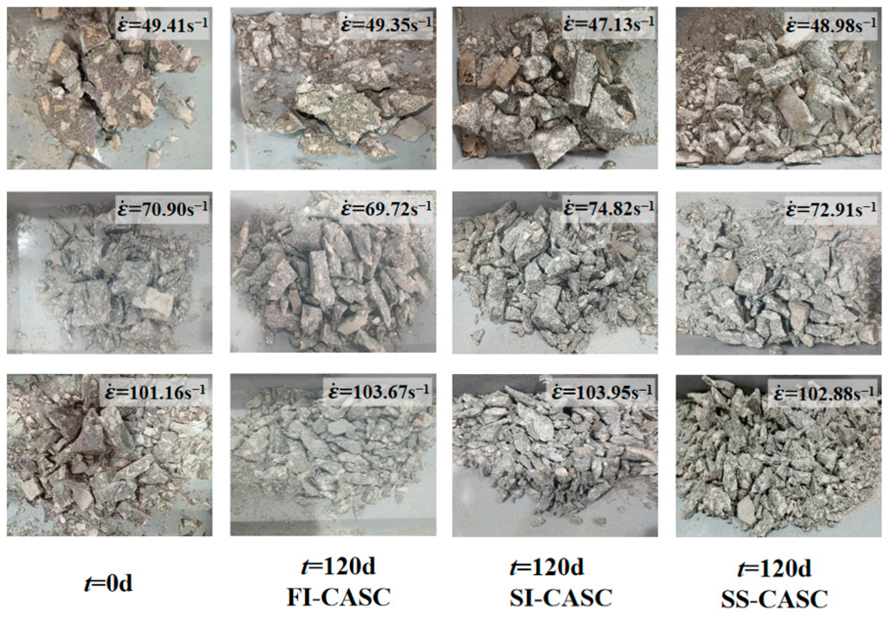 - The DIF under the three corrosion conditions increases with the increase in corrosion time and strain rate, and the size was largest in the salt-spray zone, followed by the semi-immersion zone, and smallest in the full-immersion zone. When the corrosion time is the same, with the increase in strain rate, the dynamic strength of CASC in all three conditions shows a stronger strain-rate effect than that of ordinary concrete, which is mainly due to the fact that under stronger impact loading, CASC specimens produce a large number of cracks in a short time in order to obtain the shortest energy release path, and due to the low strength of coral aggregate itself, the cracks can directly pass through the coral aggregate to dissipate the energy, thus making the dynamic strength increase.