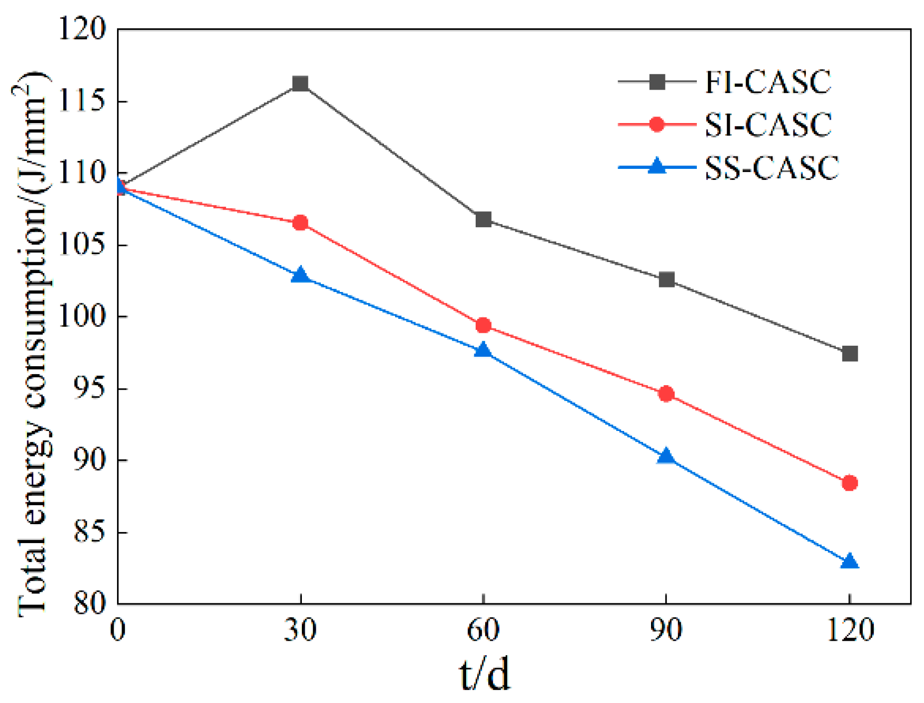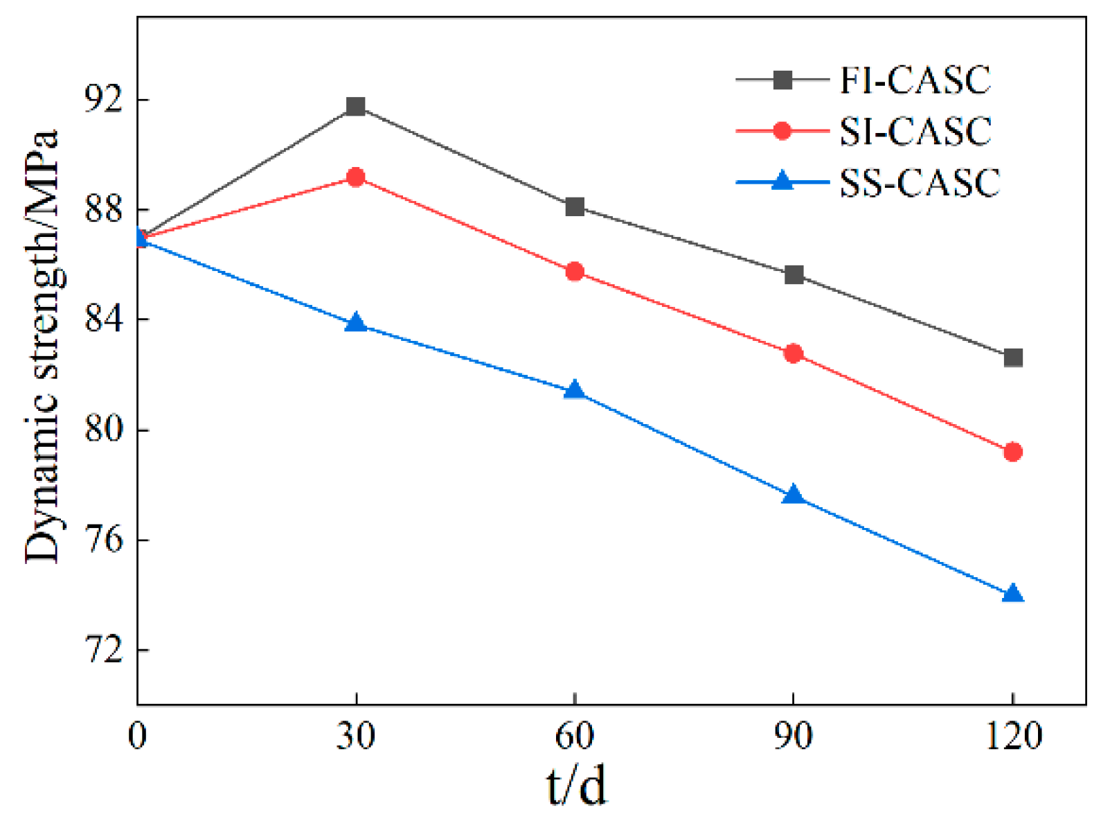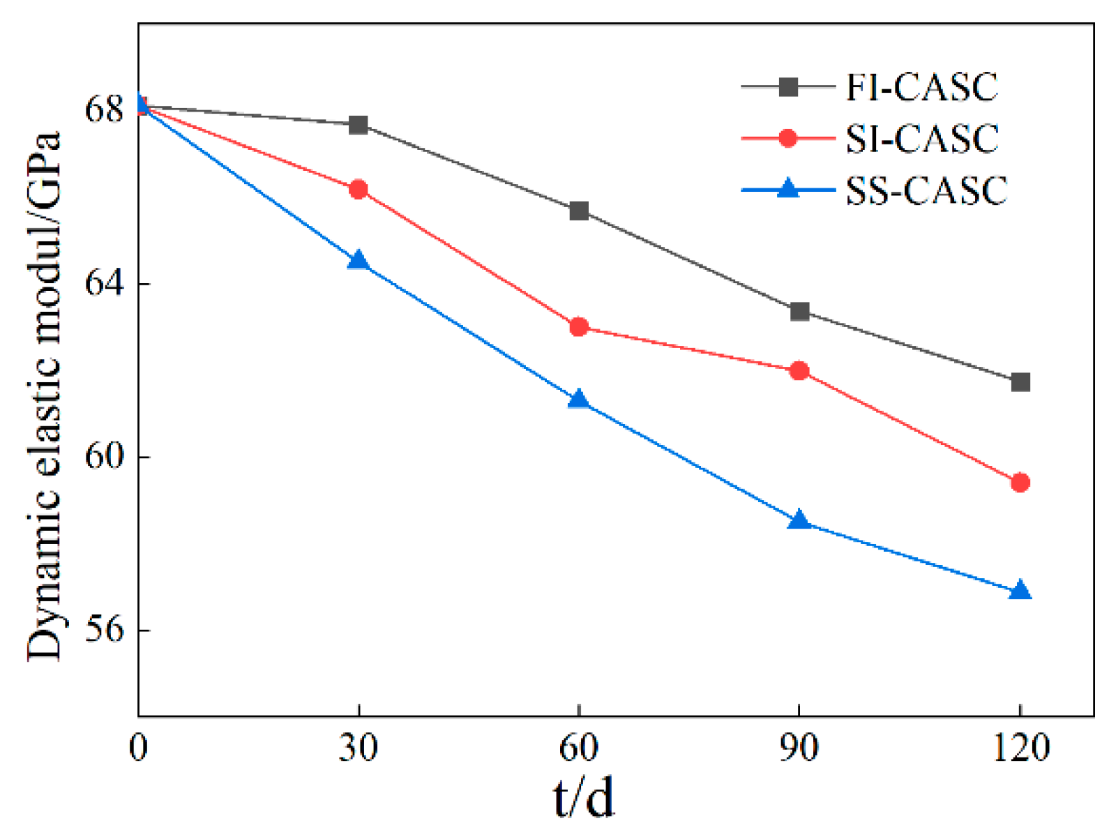 - The dynamic strength, dynamic modulus of elasticity, and total energy consumption of CASC specimens under the three corrosion conditions decreased substantially with the corrosion time during the 120 d corrosion cycle, and the degree in decrease was largest in the salt-spray zone, followed by the semi-immersion zone, and smallest in the full-immersion zone. However, due to the pore-filling effect of CASC caused by corrosion products, the dynamic strength and total energy consumption of the specimens located in the full-immersion zone appeared to be elevated at 30 d of corrosion, whereas those located in the salt-spray zone showed monotonically decreasing dynamic strength and total energy consumption. Combining the trends of dynamic strength of CASC in the full-immersion and semi-immersion zones, it can be surmised that a similar critical point exists in the early stage of corrosion for the specimens with CASC located in the salt-spray zone, after which the effect of corrosion products on CASC is dominated by destruction. It is noteworthy that the dynamic elastic moduli of both SI-CASC and FI-CASC demonstrate a continuous decline, contrasting with the trend in dynamic strength. This behavior is attributed to the formation of fine micro-cracks and pores from corrosion-product expansion. While these defects have an insignificant effect on dynamic strength, they substantially reduce the dynamic elastic modulus.