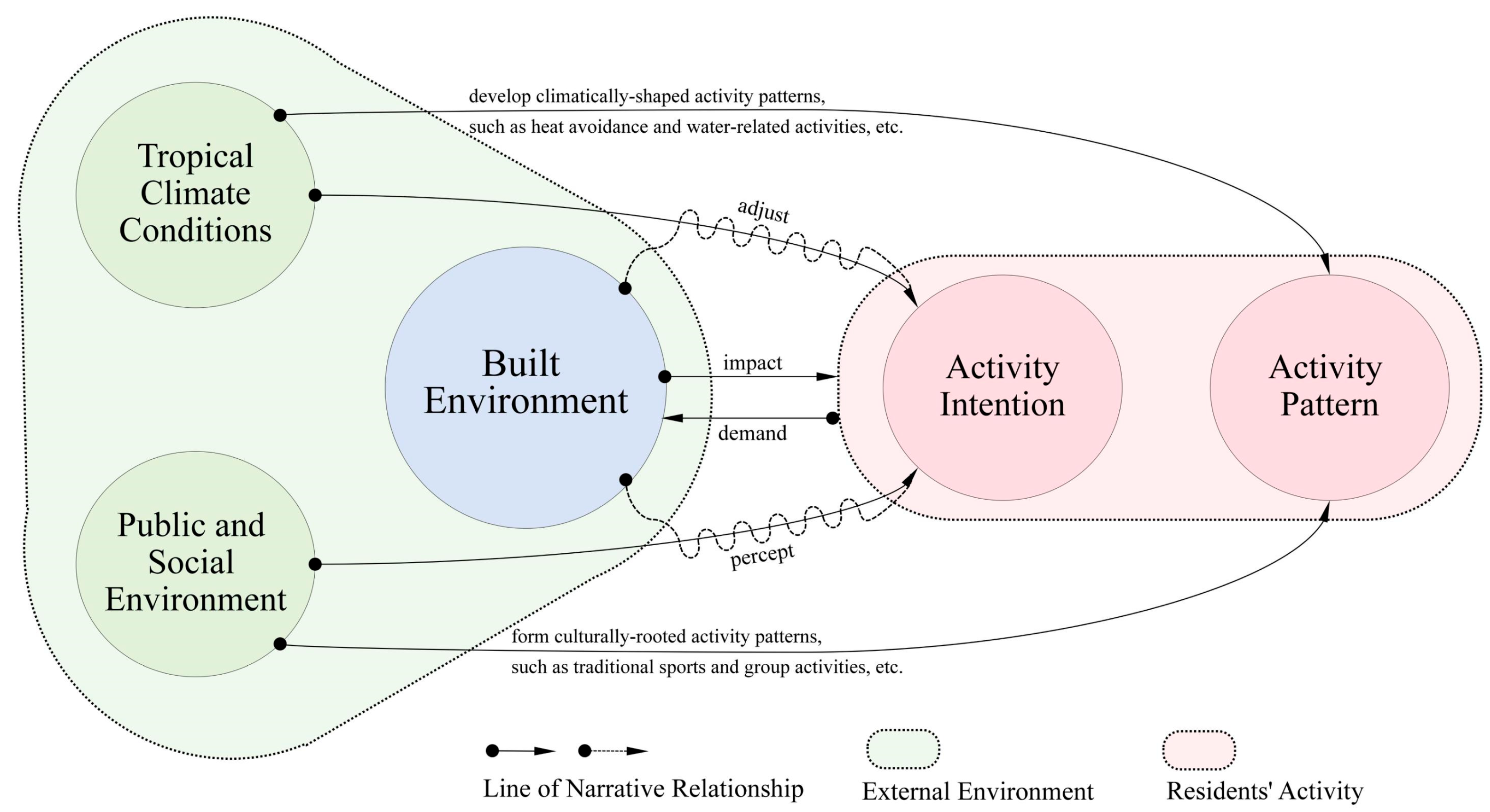 During the selective coding phase, this study conducted a systematic analysis of the core categories and refined the internal relationships among them by constructing narrative threads. Focusing on the impact of the built environment in tropical regions on residents’ willingness and patterns of physical activity, and taking the built environment as the narrative starting point, influencing factor or outcome, the study delineated 6 lines of the relation among the core categories (see