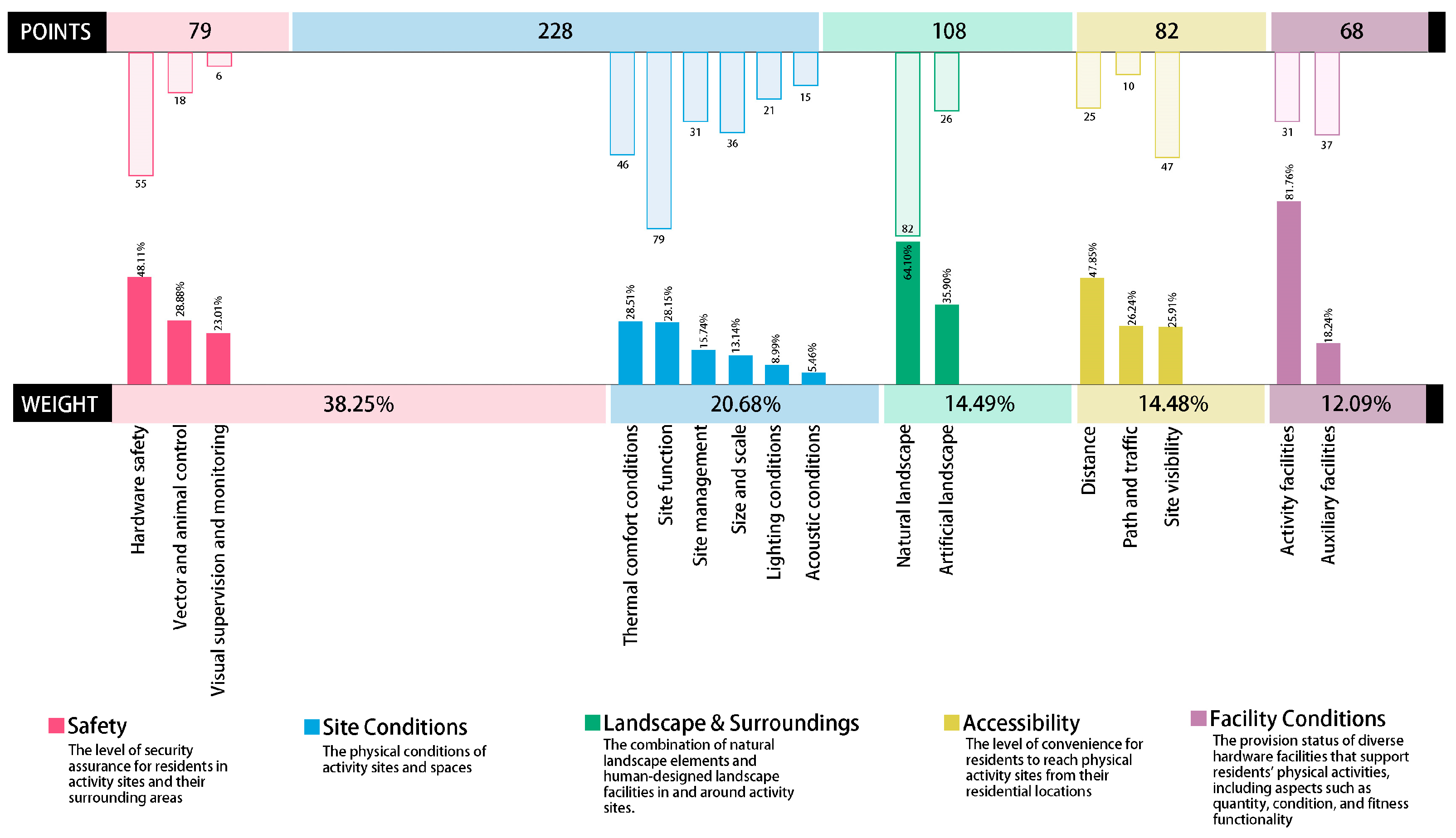 In addition, from a socio-economic perspective, the types, intensity levels, and arrangements of residents’ activities may closely relate to the economic conditions and occupation. Residents engaged in physical labor tend to choose low-intensity and restorative activities during their leisure time. This group prefers to select free public spaces that are equipped with basic functions such as sunshade facilities, ventilation equipment, and drinking water facilities. In contrast, high-income groups exhibit different preferences and behavioral patterns. They emphasize privacy, professional-grade equipment, and additional services, and have a higher acceptance and usage rate for reservation-based and membership-based venues. When planning the architectural environment, it is necessary to respond to these differentiated needs.