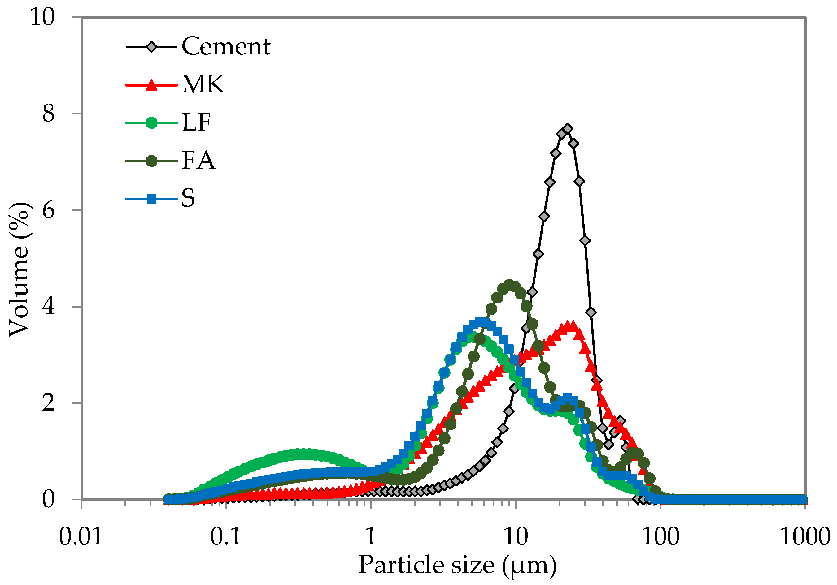 24]. Smooth and spherical particles, such as fly ash or slag, tend to reduce interparticle friction and enhance flowability, whereas angular or lamellar particles, such as metakaolin or silica fume, increase water demand and promote flocculation [