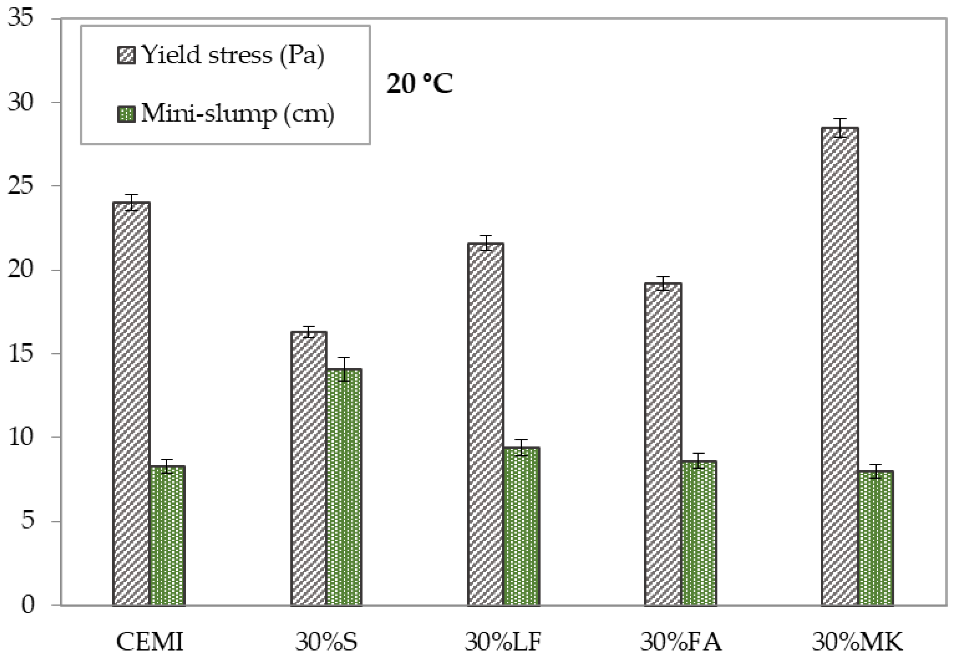 Figure 2 shows the influence of different SCMs on the initial yield stress and mini-slump flow of cement pastes at a constant w/b ratio of 0.45. The reference paste (CEM I) exhibited a yield stress of 24 Pa and a mini slump of 8.3 cm, indicating moderate consistency and flowability.