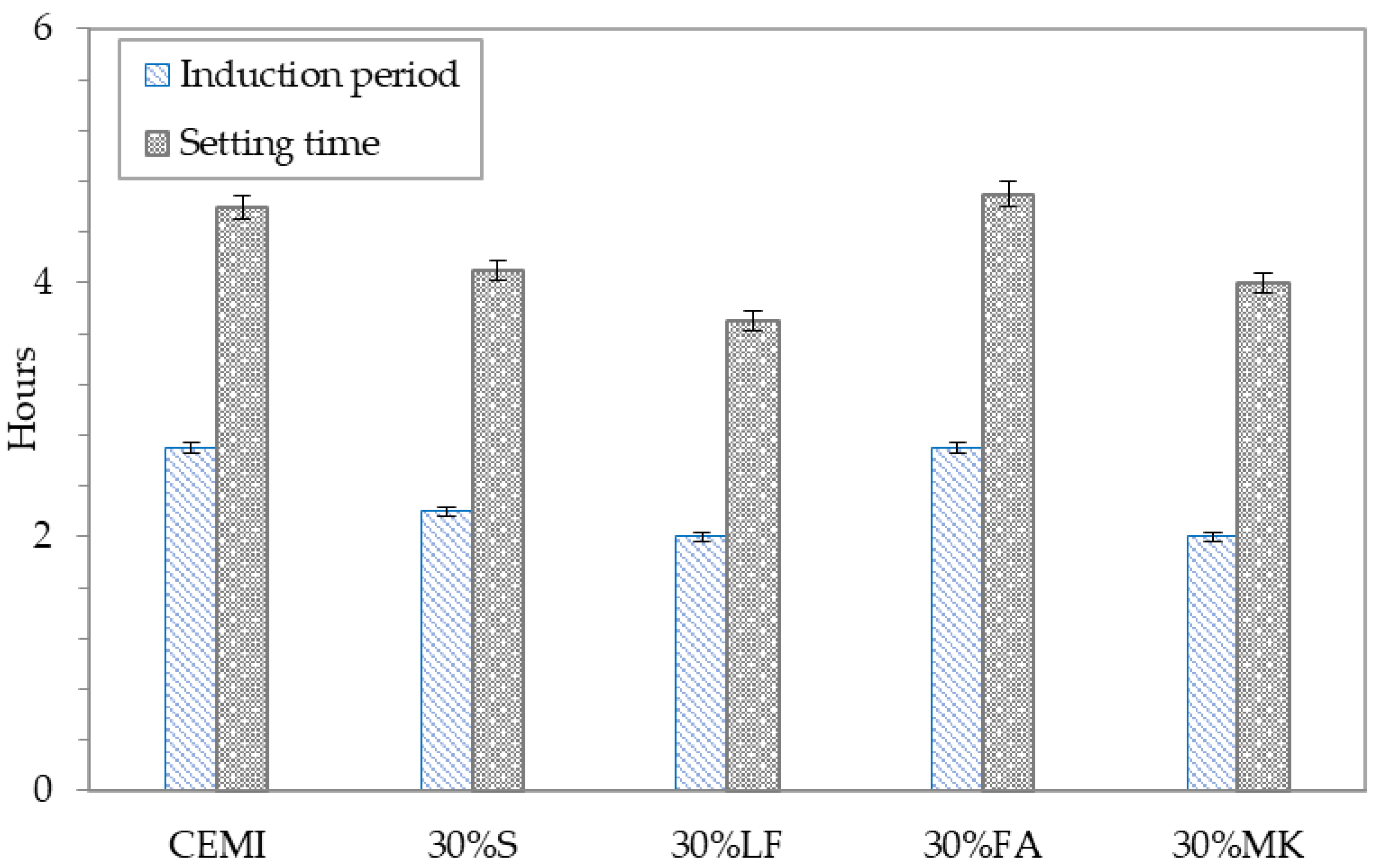 Figure 3 presents the effect of the four SCMs on hydration kinetics, expressed through the induction period and setting time. The induction period corresponds to the dormant phase or the low-activity period before the acceleration of hydration, while the setting time reflects the overall rate of structure formation within the paste [