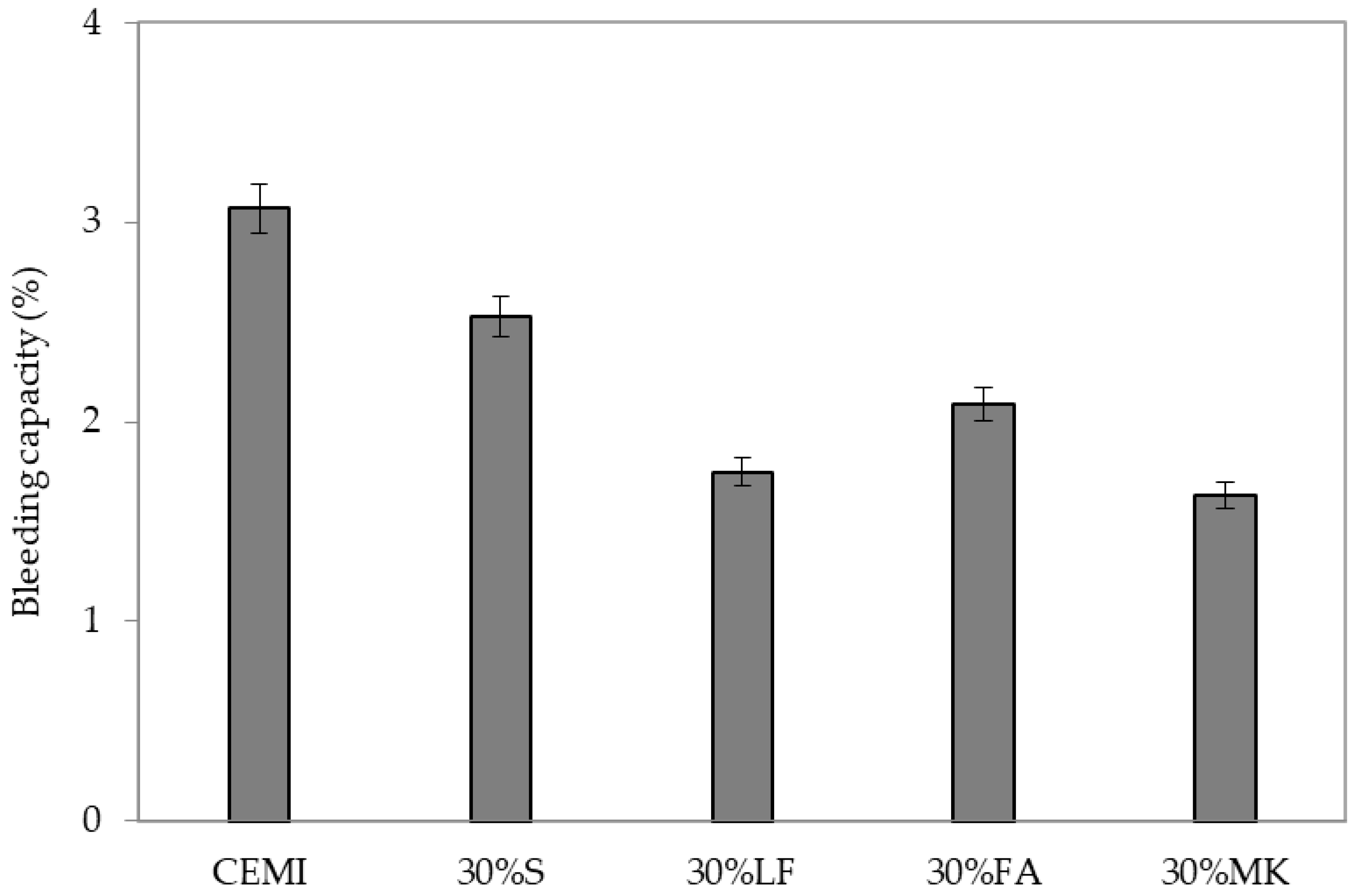 Among the SCMs, LF and MK exhibited the lowest bleeding capacities (1.8% and 1.6%), respectively. These materials refine the microstructure and improve water retention through two complementary mechanisms: (i) their fine particle size and high specific surface area enhance packing density, reducing capillary channels for water migration; and (ii) both LF and MK act as nucleation sites that promote early formation of hydrates, partially blocking percolation paths. These results are consistent with previous studies [