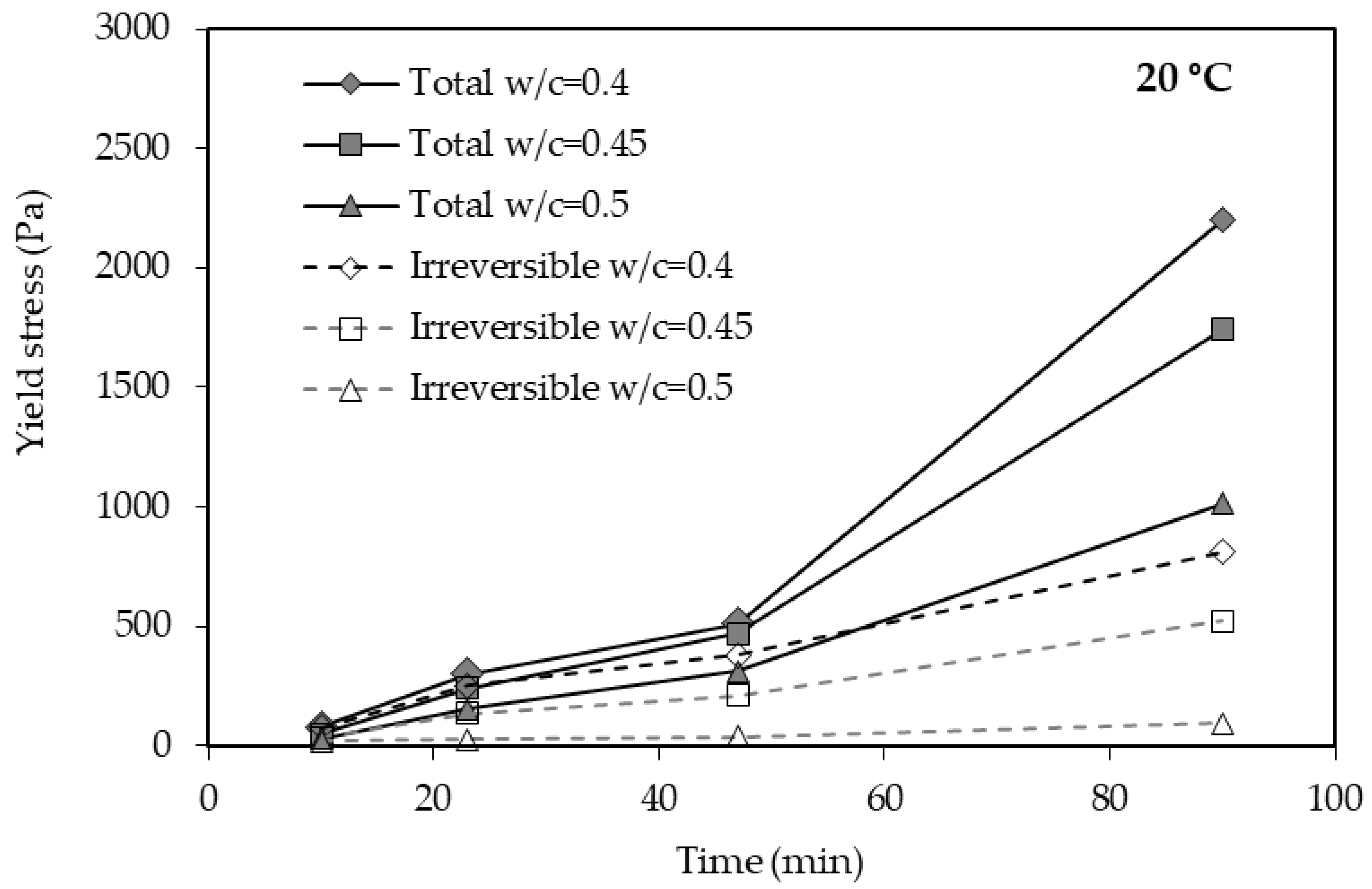 Figure 5 illustrates the evolution of the static yield stress of reference cement pastes prepared at three w/c ratios (0.40, 0.45, 0.50). Both the total and irreversible build-up components are reported as a function of rest time.