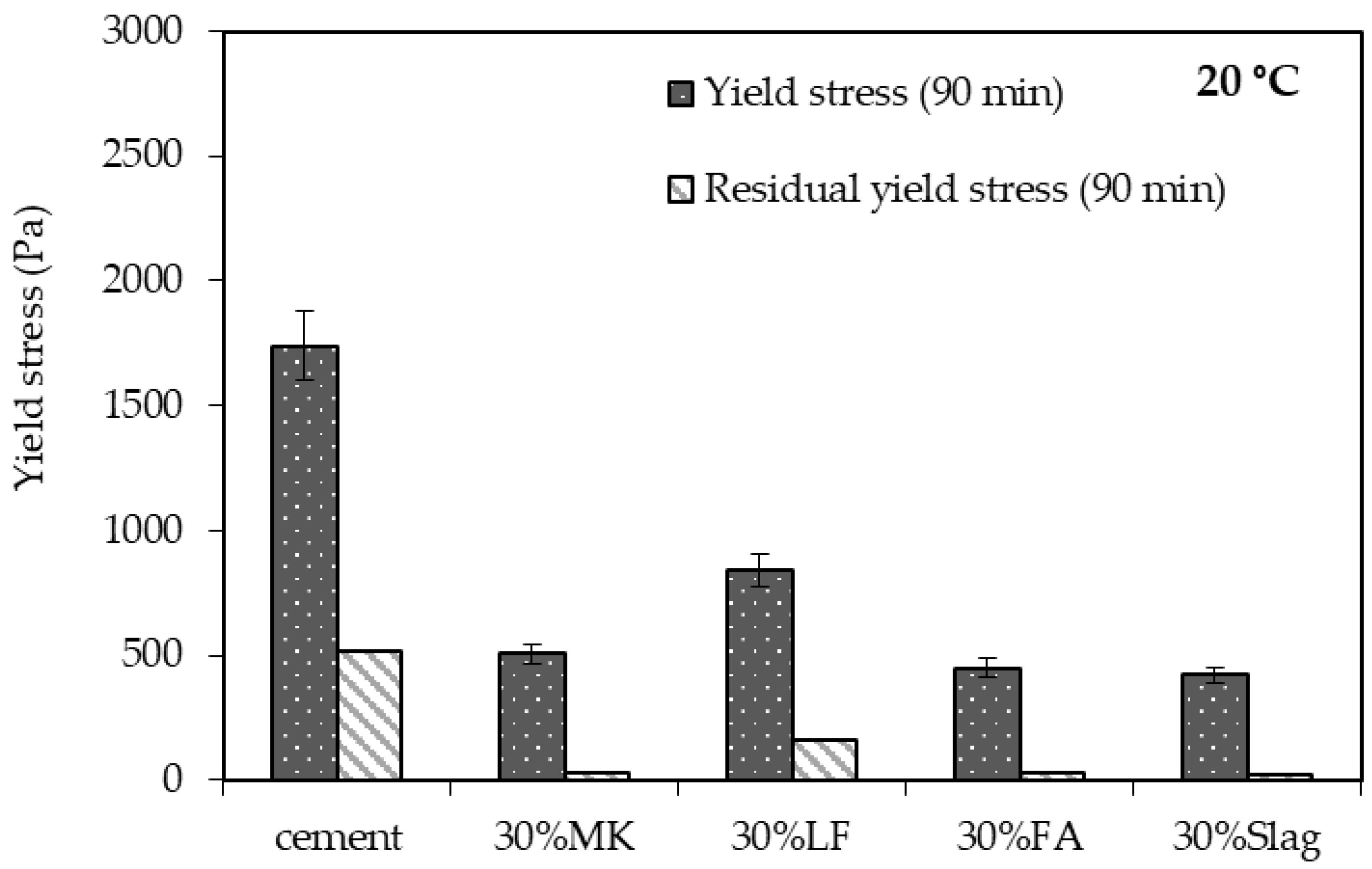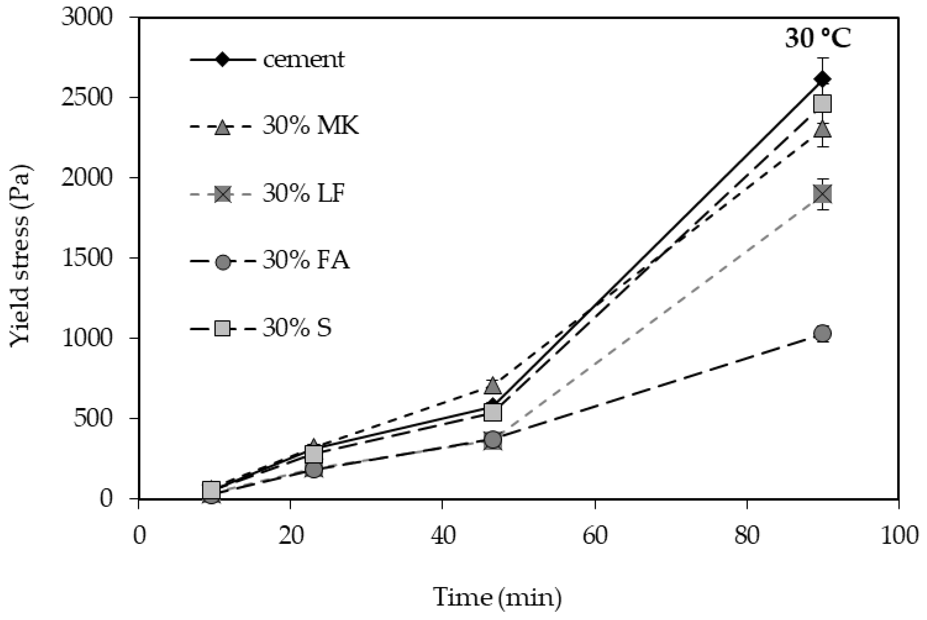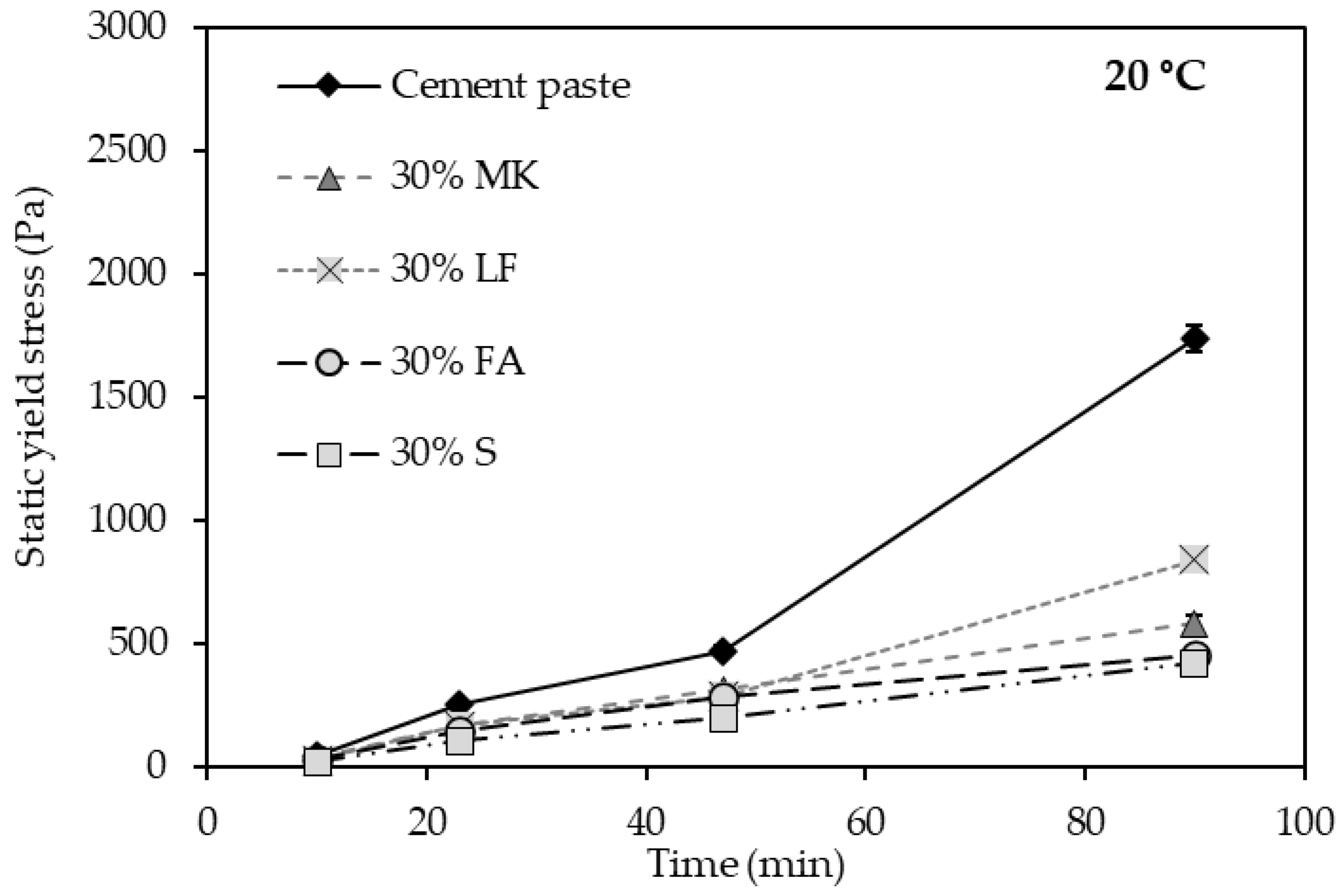 Slag, limestone filler, and metakaolin accelerated early hydration; however, this acceleration did not translate into higher structural build-up. These results confirm that the early evolution of yield stress is governed primarily by physical flocculation and colloidal interactions, rather than by hydration-driven bonding.
