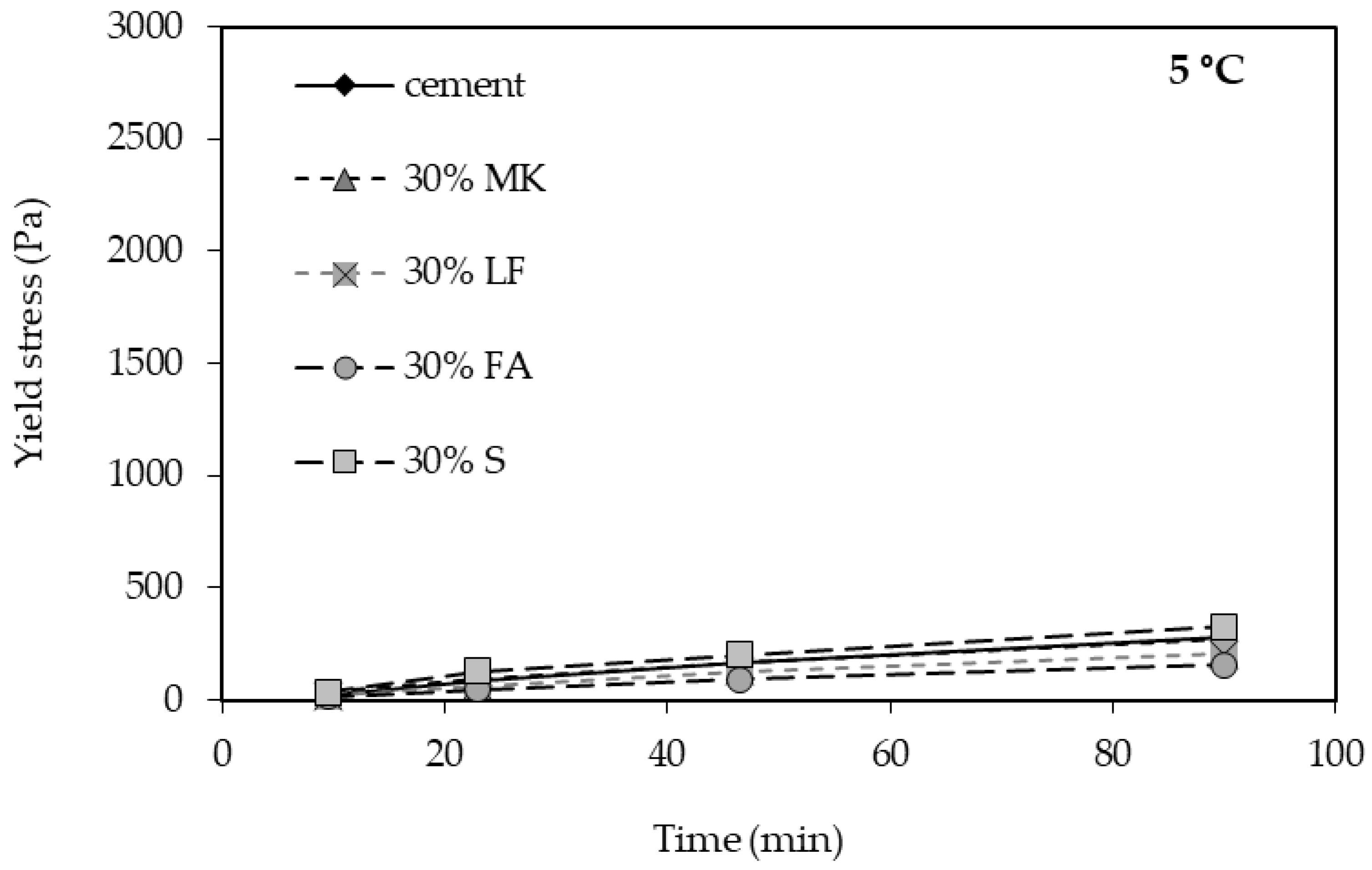 12], confirming that SCMs affect the early rheological response primarily through physical and colloidal mechanisms, which set the initial conditions for subsequent structural build-up. In addition, according to Cai et al. [