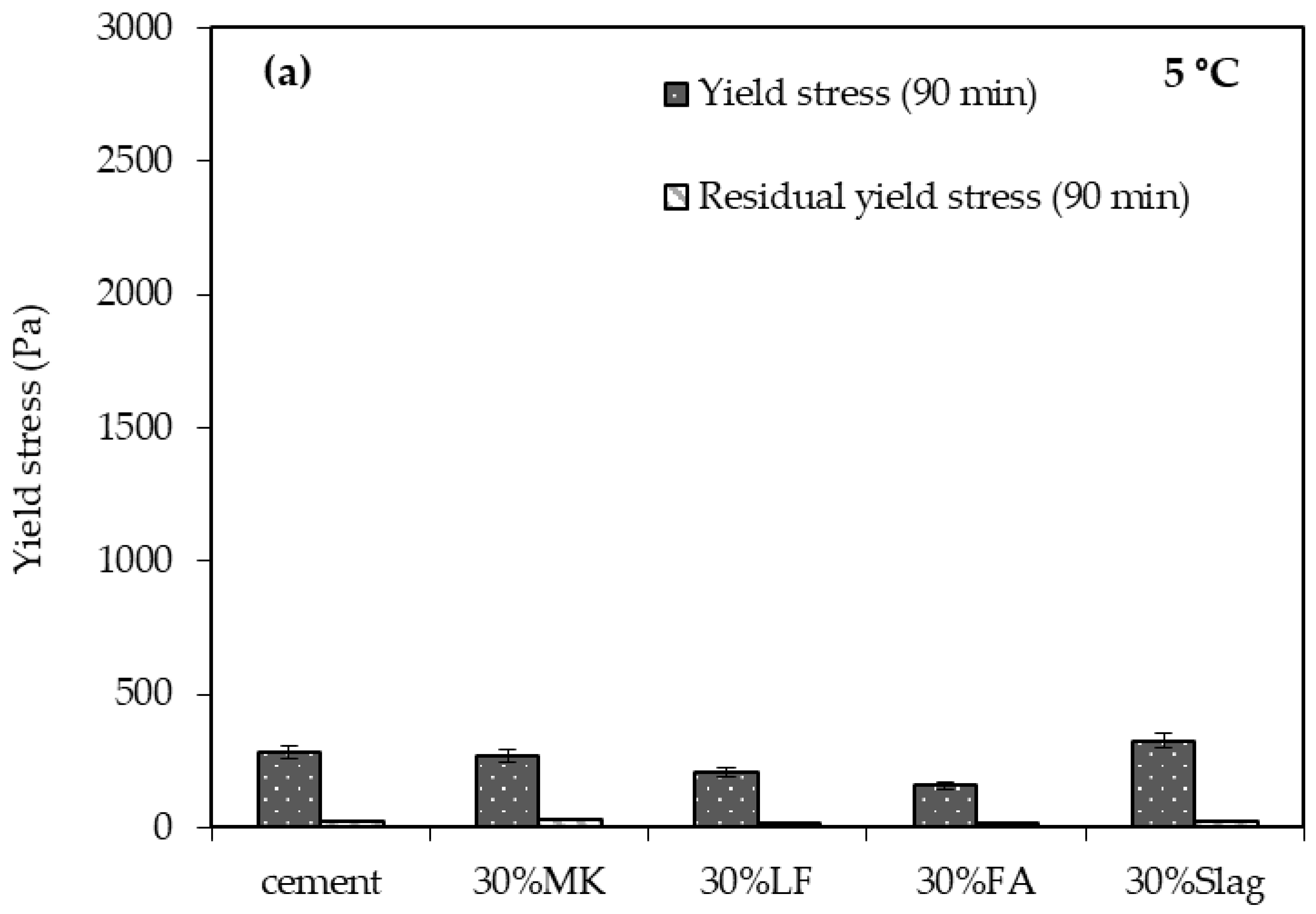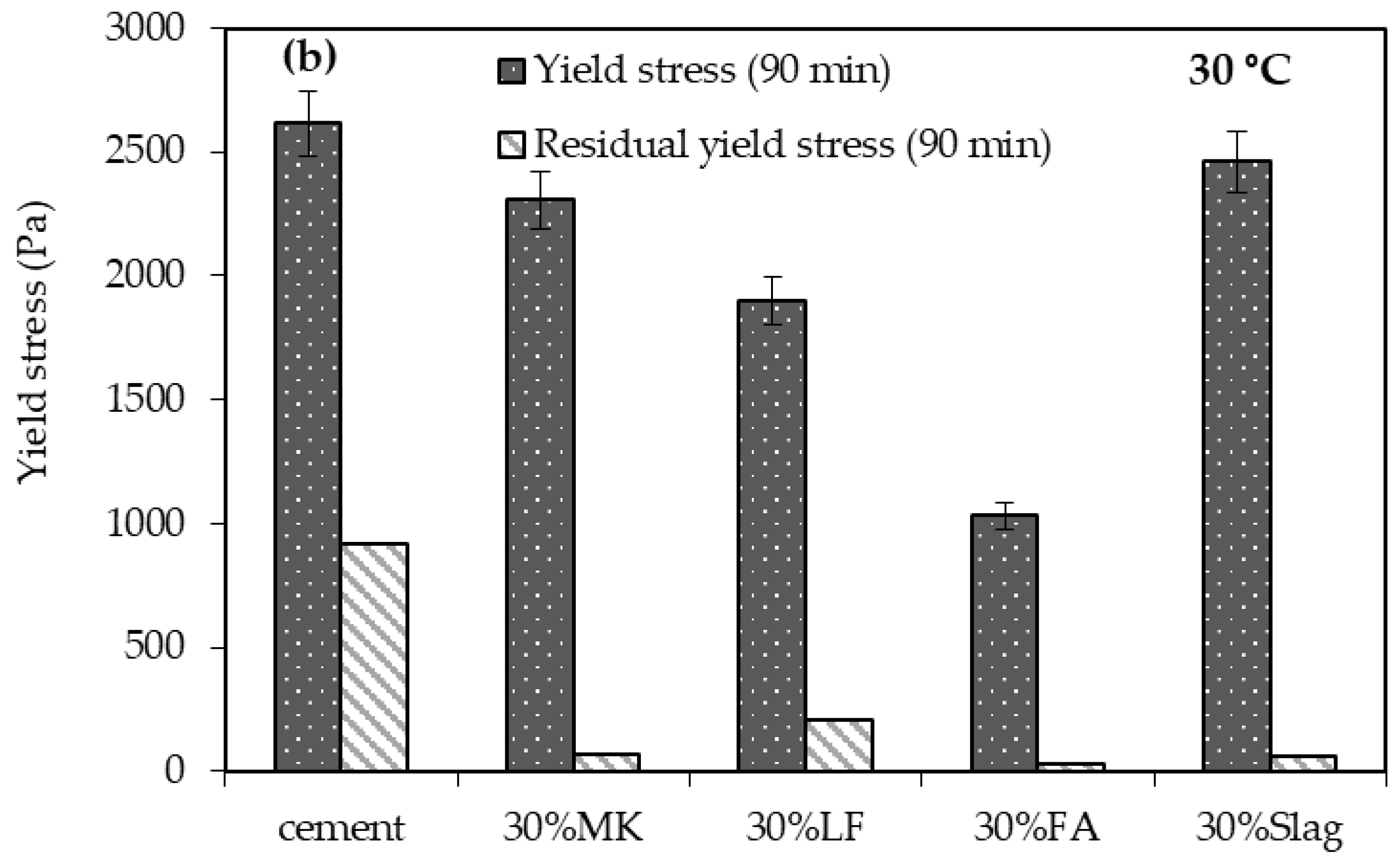 Figure 7 present the time-dependent evolution of static yield stress for cement pastes containing 30% of different SCMs, as well as the corresponding residual (irreversible) yield stress after 90 min of rest. These results provide complementary insights into how mineral additions influence both the kinetics and the nature of structuration.