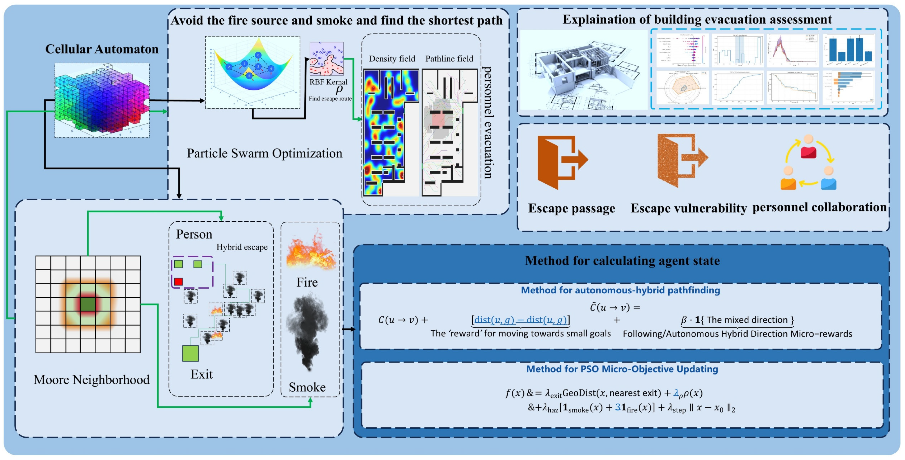 A CA-PSO multi-field coupled evacuation model framework is proposed: Cellular Automaton is used to discretize the evacuation space into a two-dimensional raster; Gaussian kernel estimation is combined to construct a smooth density field for avoiding pedestrian congestion; a hazard field propagation model is established based on the Moore norm and random rounding method; meanwhile, a PSO micro-objective update strategy is adopted to decompose the long-term exit target into local micro-objectives, realizing dynamic optimization of individual evacuation decisions and solving the disconnection between spatial simulation and individual decision-making in traditional models.