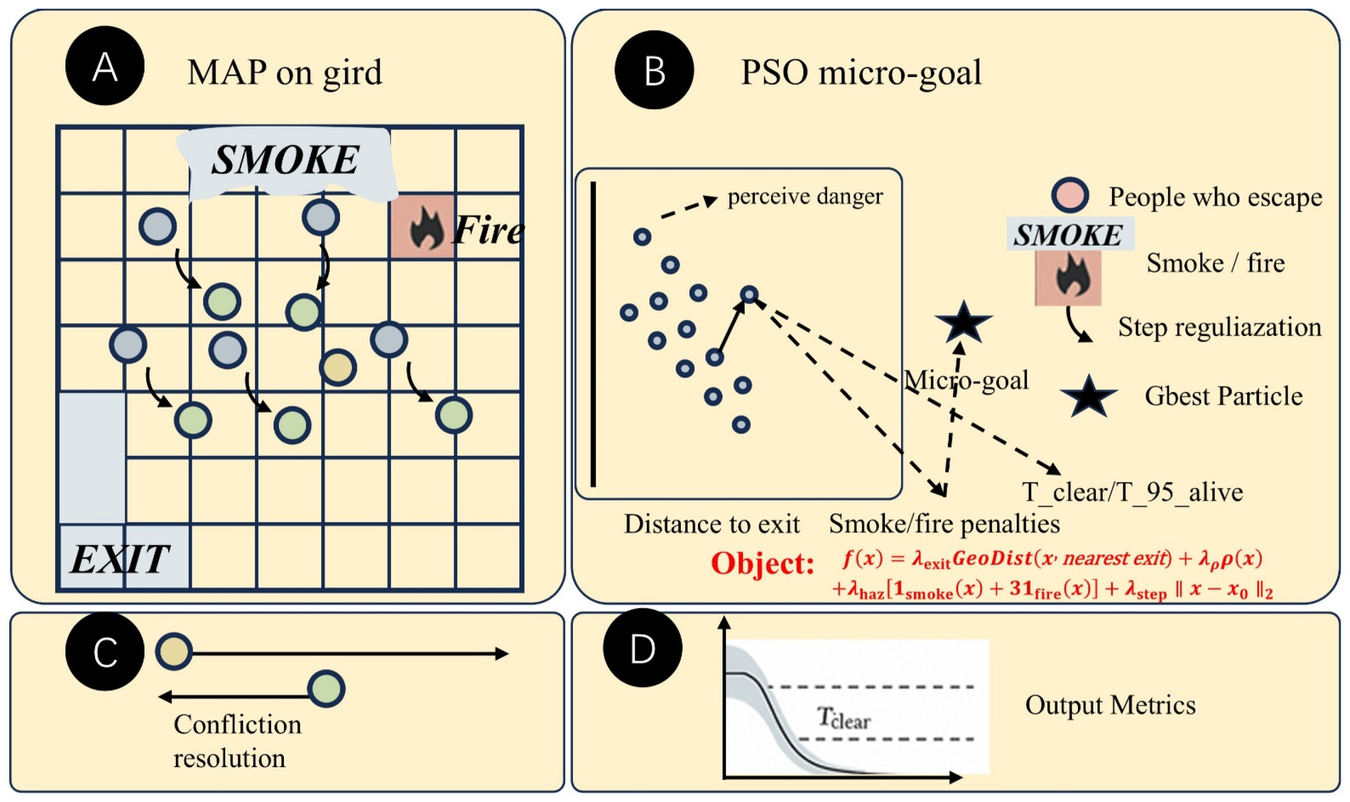 Figure 2 outlines the “CA Grid + PSO Micro-objective” model adopted in this study and its evaluation process. Subfigure (A) illustrates the scenario on a discrete grid: circles represent pedestrians, arrows indicate single-step movements, green areas denote exits, light blue/grey regions represent smoke, and orange regions indicate the fire source. Pedestrians advance towards exits under the influence of fire and smoke as well as geometric constraints. Subfigure (B) presents the PSO micro-objective mechanism: particles are placed within a local window centered on each pedestrian, and a search is performed based on the objective function to identify the global best particle, which serves as the micro-objective for the current step. The legend labels elements such as “evacuees, smoke/fire, and step size regularization”. Subfigure (C) depicts conflict resolution: when multiple pedestrians compete for the same target grid cell, processing is conducted in accordance with rules to avoid collisions. Subfigure (D) shows the output indicators: total clearance time, the 95th percentile time of surviving pedestrians, and optional bottleneck occupancy curves are recorded and summarized.