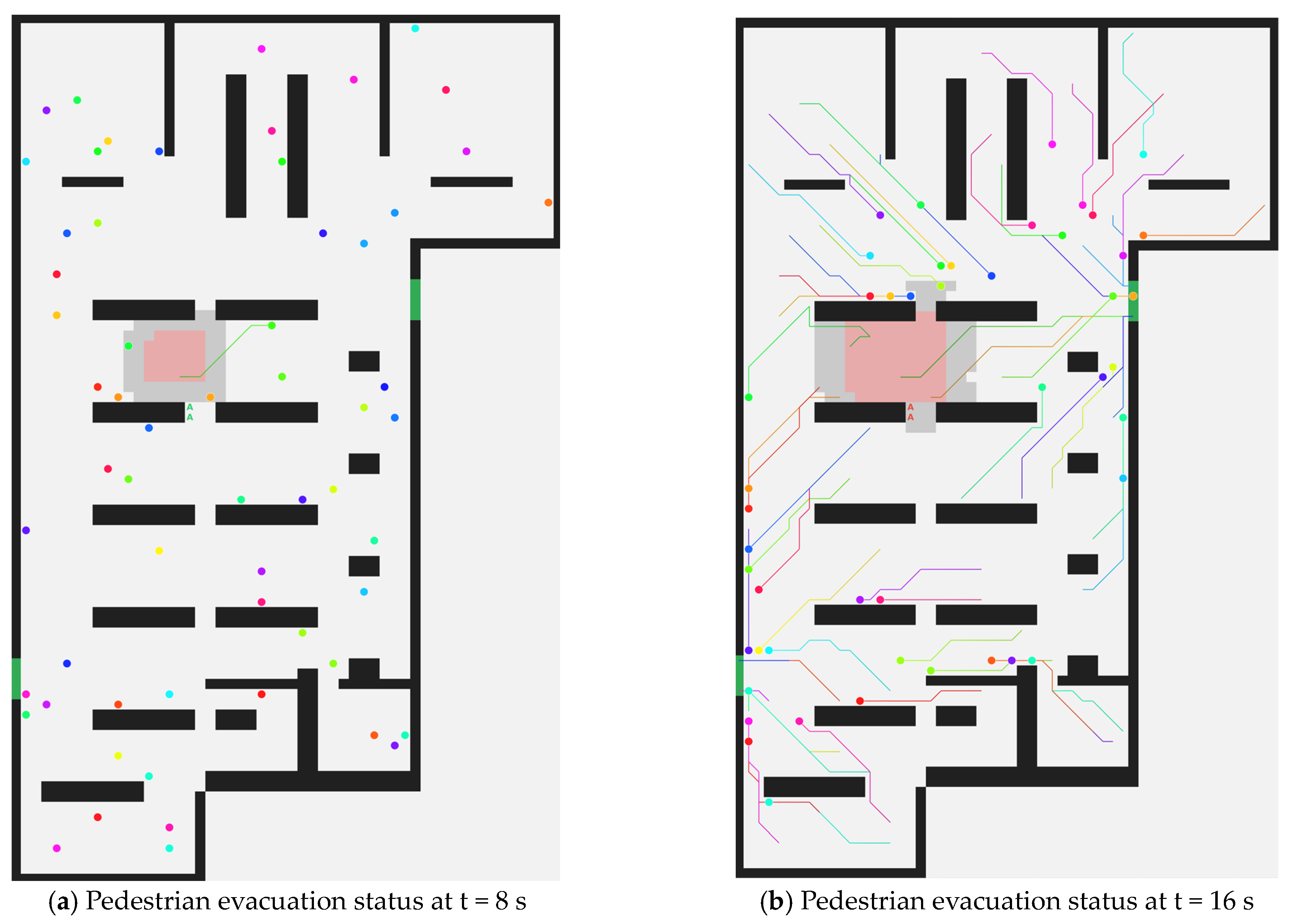 Figure 4 shows the combined pedestrian evacuation path planning and trajectory diagram. Two color schemes are used to indicate the pedestrian combination state: blue indicates pedestrians adopting autonomous hazard avoidance, while other colors indicate pedestrians adopting hybrid hazard avoidance. All pedestrians completed evacuation a t = 33 s. Subfigures (a), (b), and (c) show the evacuation status at t = 8 s, t = 16 s, and t = 24 s, respectively; the movement trajectory of each particle is shown in subfigure (d).