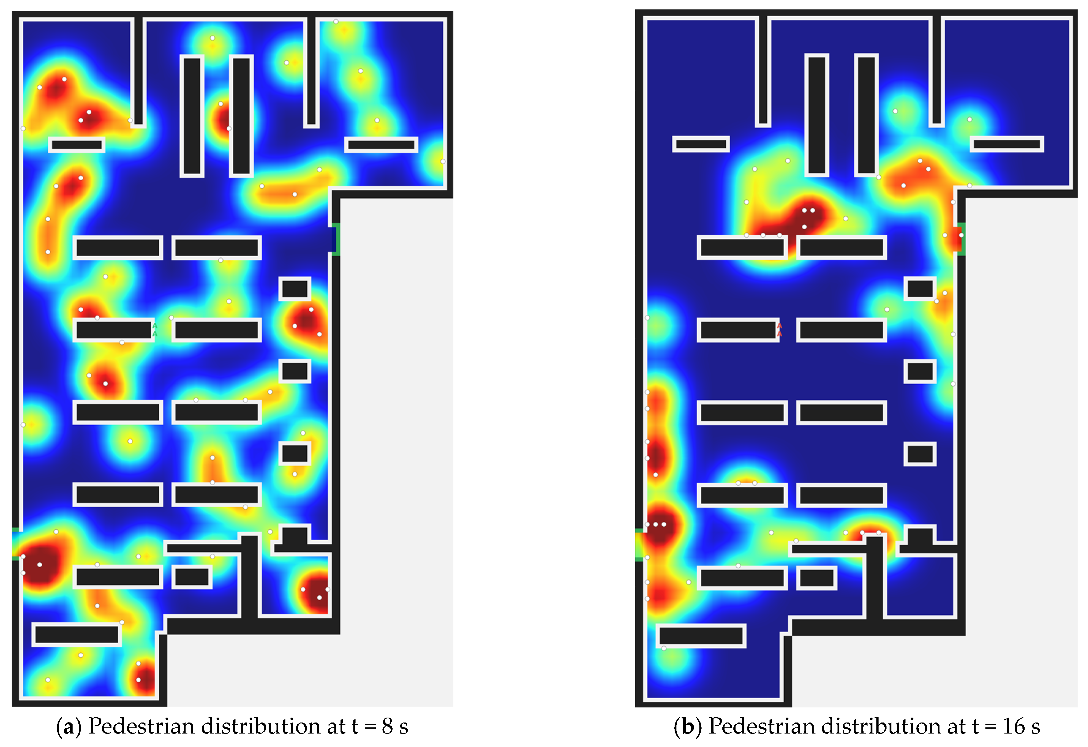 Figure 5 shows the density heatmap of combined pedestrian evacuation during the evacuation process, presenting the density distribution of pedestrians. White dots represent pedestrians, and the red-blue color scale indicates the pedestrian distribution: darker red indicates a larger number of pedestrians, while darker blue indicates a smaller number of pedestrians. Subfigures (a), (b), and (c) show the pedestrian distribution during evacuation: pedestrians are evenly distributed in (a); pedestrians gradually move closer to the two exits in (b); pedestrians are mainly concentrated at the exits in (c); all pedestrians have completed evacuation in (d). This figure can be used to analyze the reasonable building structure and pedestrian evacuation congestion, providing a basis for subsequent analysis.