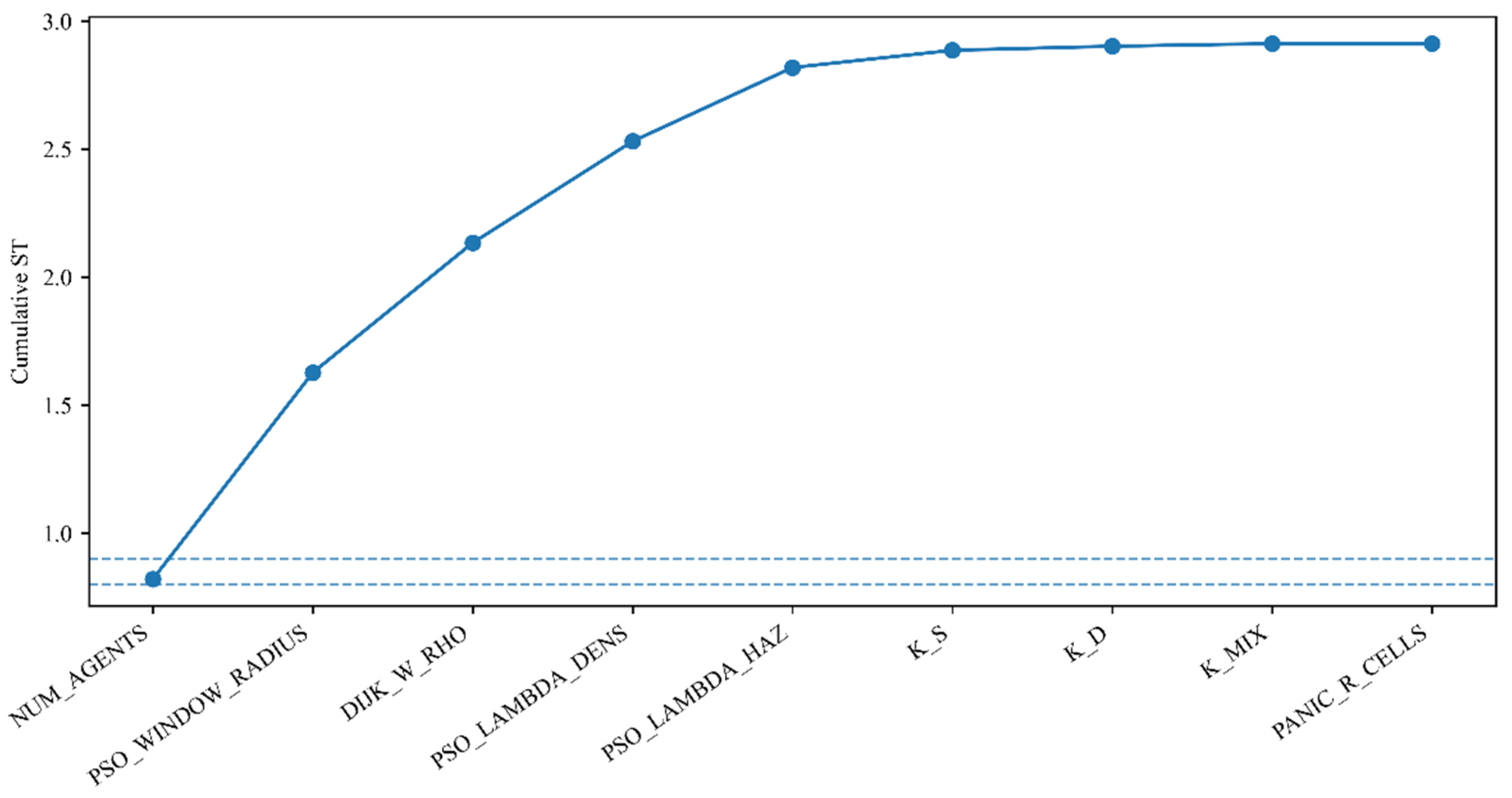 Figure 8 shows the cumulative sum of S_T in descending order, quantifying “how many parameters are needed to explain most of the variance”. The curve exceeds 1.6 after the first two parameters (NUM_AGENTS, PSO_WINDOW_RADIUS), approaches 2.1 after adding DIJK_W_RHO, and reaches approximately 2.5–2.8 after further adding PSO_LAMBDA_DENS and PSO_LAMBDA_HAZ. Combined with the 0.8/0.9 reference lines in the figure, it can be seen that the first 2–3 parameters can cover most of the total effect, and the first 5 parameters can explain almost all observable variations. This provides direct basis for subsequent model simplification and experimental design (prioritizing control of the first 3–5 key factors).