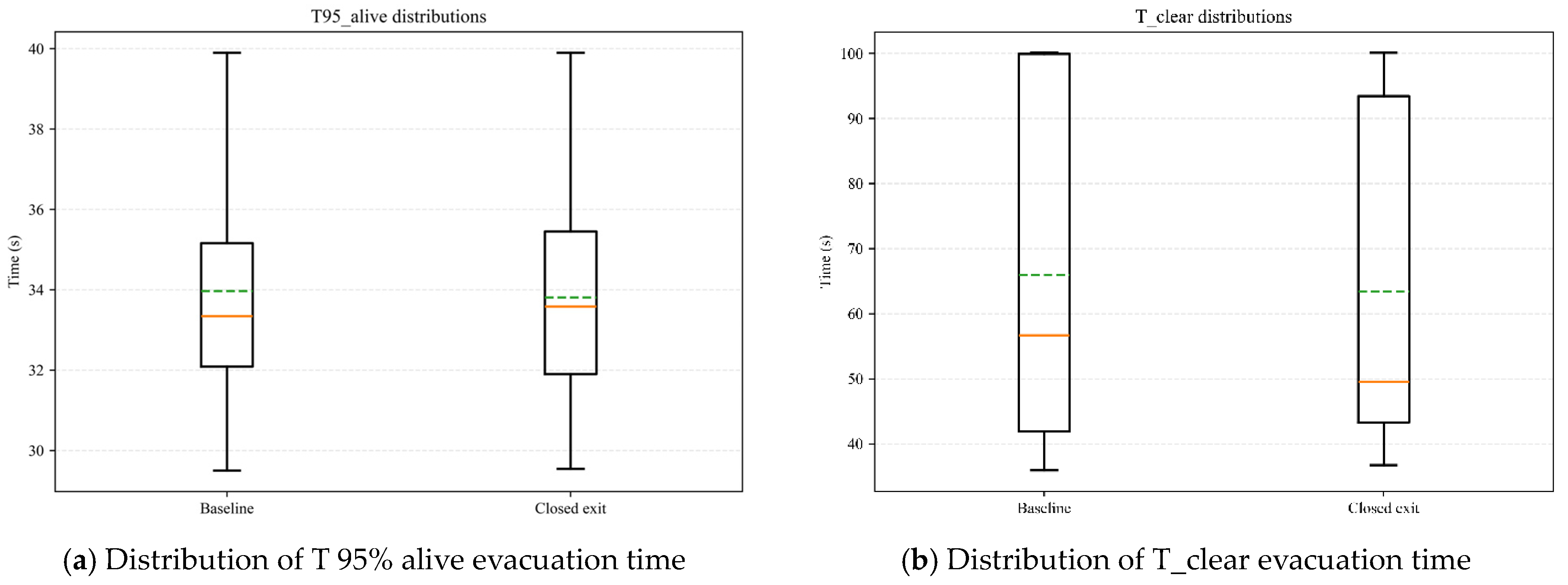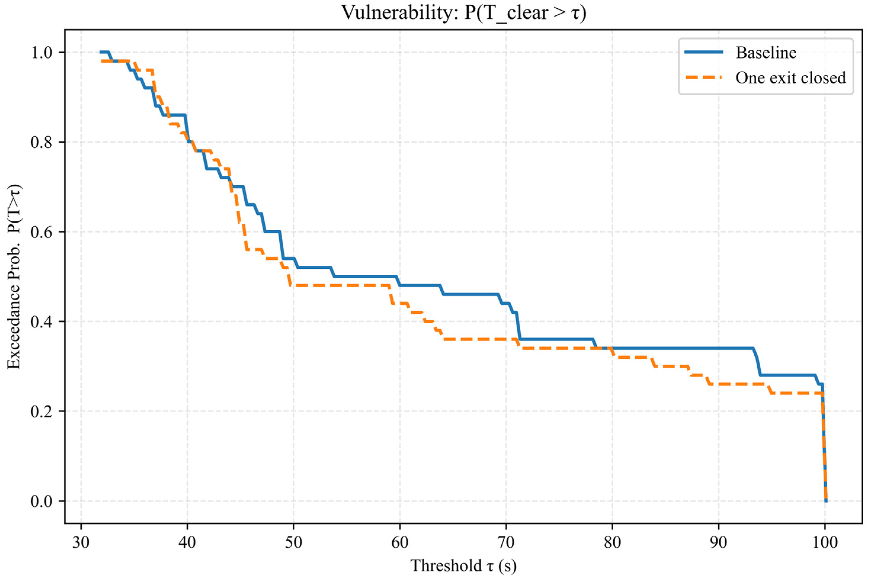 Figure 12 shows the exceedance probability curve (survival function) of the clearance time T_clear: P ( T _ c l e a r > τ ) . A lower curve indicates a smaller probability that “clearance time exceeds τ at a given threshold τ , meaning a more robust system. Overall, the orange dashed line (one exit closed) lies below the blue solid line (Baseline) in the range of τ 45 95 s , with a typical difference of 3–10 percentage points (e.g., decreasing from ~ 0.44 to ~ 0.36 at τ 70 s . This indicates that under the current layout and behavior rules, closing one exit reduces the probability of clearance time exceeding the threshold, making evacuation faster and more predictable. The two curves almost overlap at very short thresholds < 40 s , indicating that extremely fast clearance is inherently rare. The gap between the two curves converges at larger thresholds 80 s and both decrease to 0 as τ 100 s . However, long-tail risks still exist, and reducing exit options actually mitigates path diversion and conflicts. Nevertheless, the effect magnitude is limited and model-dependent, so careful evaluation based on geometry and crowd management strategies is still required in practical facilities.