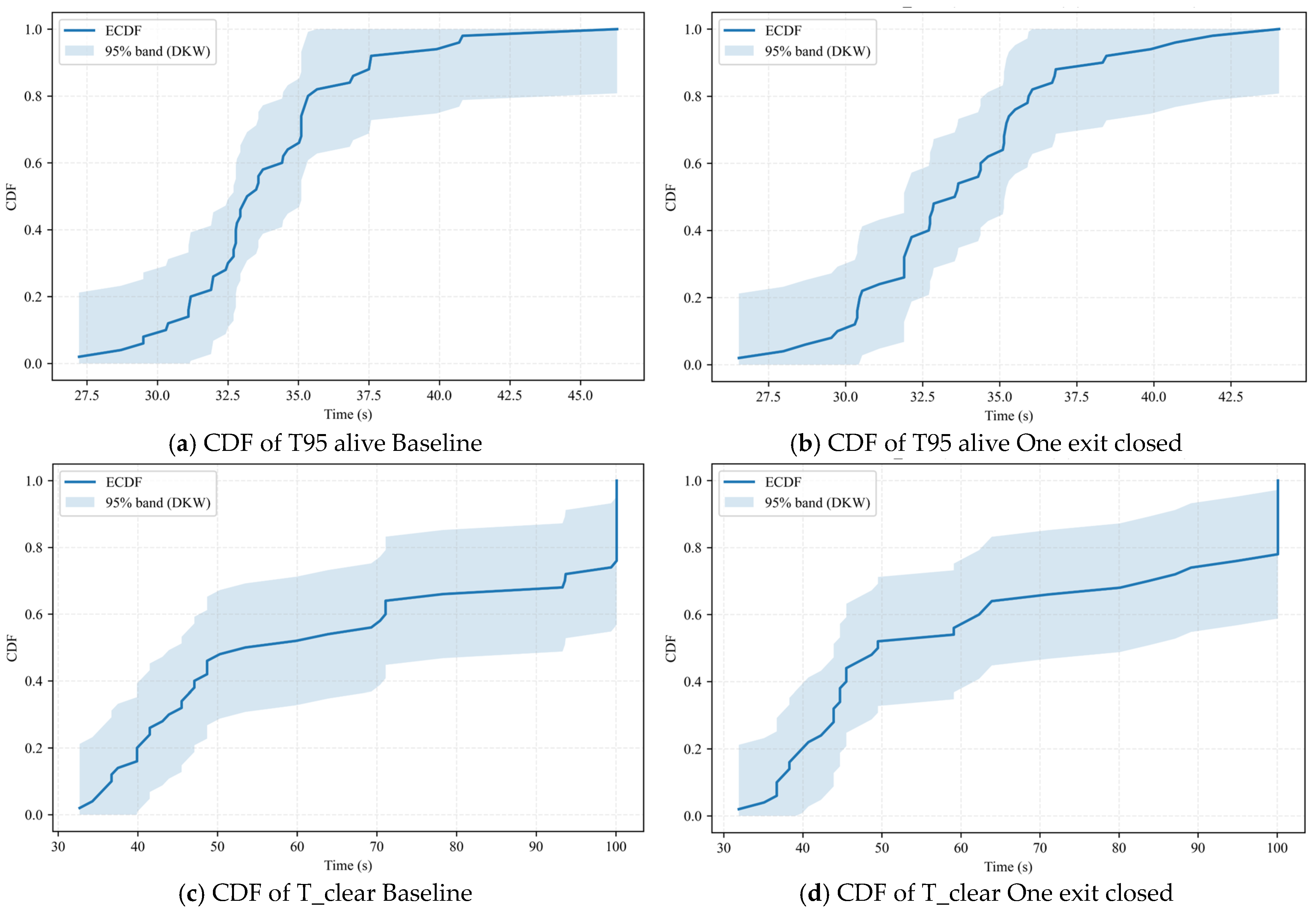 Figure 10 generally depicts the box plots comparing the scenario with exits closed and the baseline scenario. In Figure 11, subfigures (a) to (d) show the CDF plots of the two indicators under the “Baseline” and “One exit closed” scenarios, presenting the distribution positions and tail behaviors. For T 95% alive, the two curves highly overlap in the 0.2–0.9 quantile range, with only a slight misalignment near the median. This indicates that closing one exit has little impact on the overall position of the “time required for 95% of surviving pedestrians to complete evacuation”, but the right tail converges slightly, resulting in fewer extremely slow cases. For T_clear, the curve for the exit-closed scenario shifts to the left in the high quantile range (e.g., 0.8–0.95), indicating a reduced probability of long clearance times; in other words, the long-tail risk of very long clearance is mitigated. Overall, the key conclusion from the CDF plots is that closing one exit does not significantly change the evacuation efficiency of typical cases, but it can suppress the long tail of T_clear and reduce the probability of clearance delays caused by extreme congestion. This implies that management does not need to adopt a one-size-fits-all approach of “more exits are better”; instead, the “system benefit” of each exit should be evaluated through simulation/monitoring. Under necessary circumstances, some underperforming exits can be temporarily closed or restricted, or crowds can be guided to merge into more efficient paths earlier to mitigate long-tail risks.