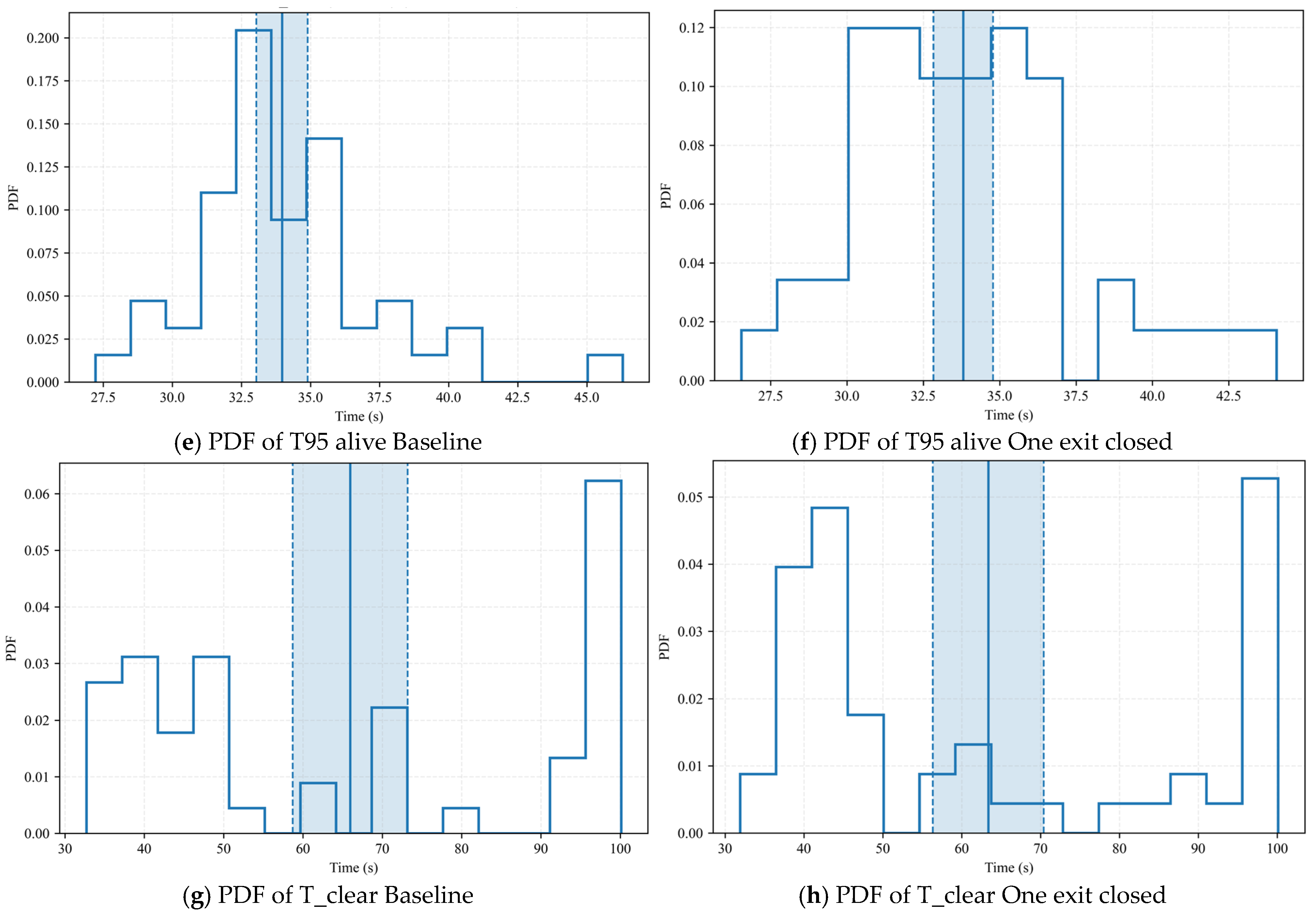 Subfigures (e) to (h) show the PDF plots, which further characterize the central tendency and dispersion. For T 95% alive, both scenarios show a single peak, with the main distribution concentrated in the 30 s range; compared with the Baseline, the “One exit closed” scenario shows a narrower main peak and a shorter right tail, indicating slightly smaller differences between individuals and better stability. For T_clear, the density under the Baseline is more dispersed, with an obvious long tail and secondary peak on the right, reflecting delayed clearance in some simulations; in the “One exit closed” scenario, the density is more concentrated in the medium-time range, with reduced weight in the right tail, suggesting that extreme congestion cases are suppressed. Consistent with the CDF conclusions, the PDF plots focus on revealing changes in distribution shape: the typical level remains basically unchanged, but the fluctuation range and the incidence of ultra-long-time events decrease when one exit is closed.