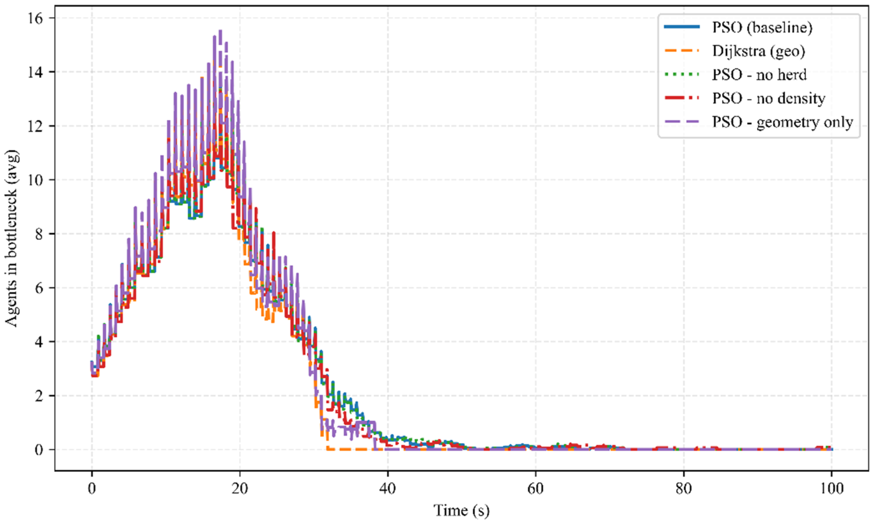 In this study, clearance time T_clear and 95% pedestrian evacuation time are selected as core evacuation indicators. For UQ sampling, fixed parameters are used [27], 50 random seeds are set, and PDF/CDF boxplots are generated. Under the baseline of closed exit conditions, the vulnerability curve is calculated as P ( T c l e a r > τ ) = 1 F ^ T c l e a r ( τ ) , where τ is the scanning interval. On this basis, guidance baselines under geometry-only conditions (without PSO), no herd following, no density term, and geometry-only state are established for ablation experiments.