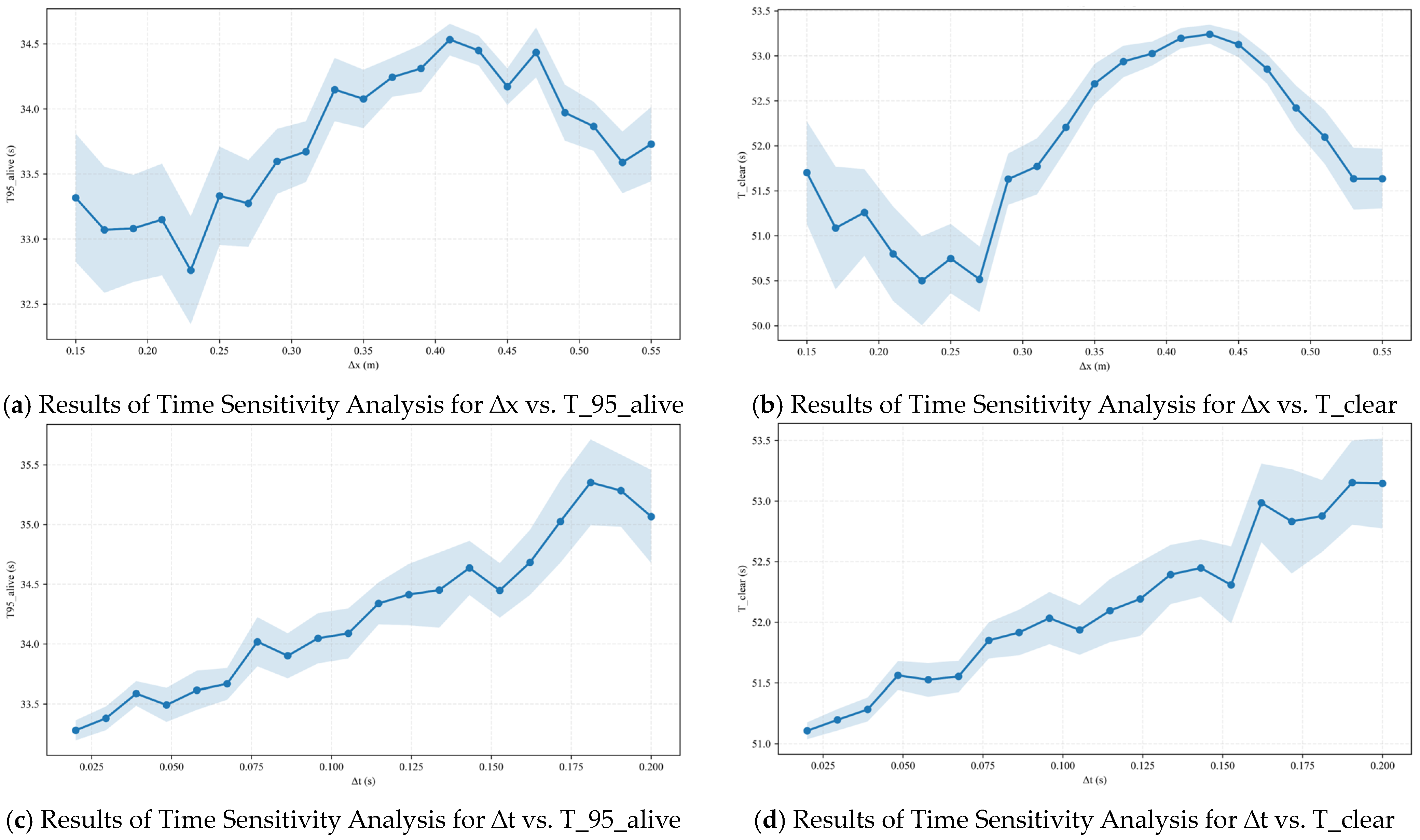 For Δx–T_clear: It shares a similar shape to the aforementioned curve, with lower values around 0.23–0.27 m and higher values at 0.41–0.45 m, with a magnitude of approximately 2.5–2.7 s. Similarly, the high degree of overlap in the confidence bands indicates that the effects induced by Δx are second-order effects/discrete resonance rather than systematic biases; thus, selecting Δx ≈ 0.25 m can serve as a robust baseline.