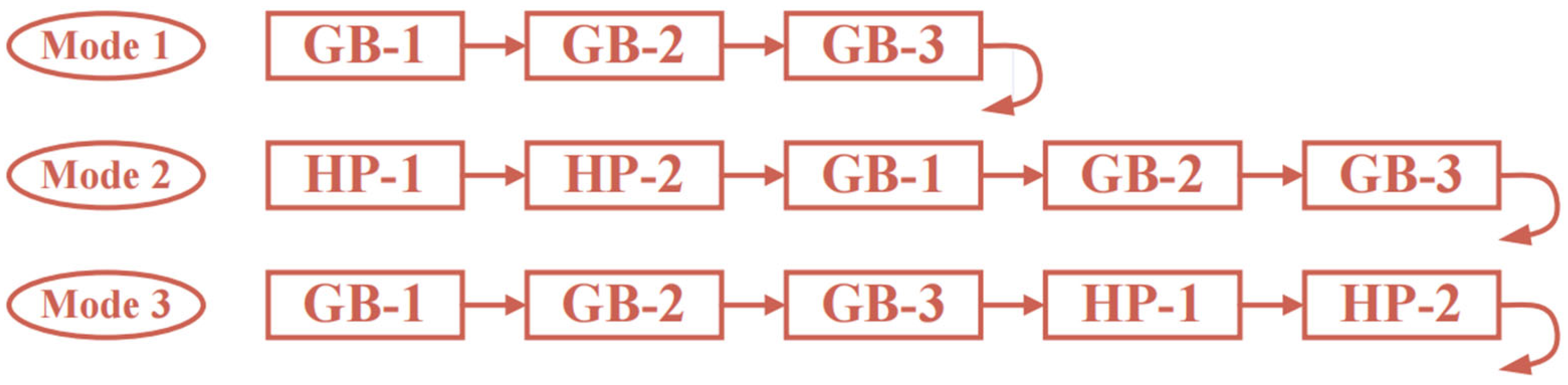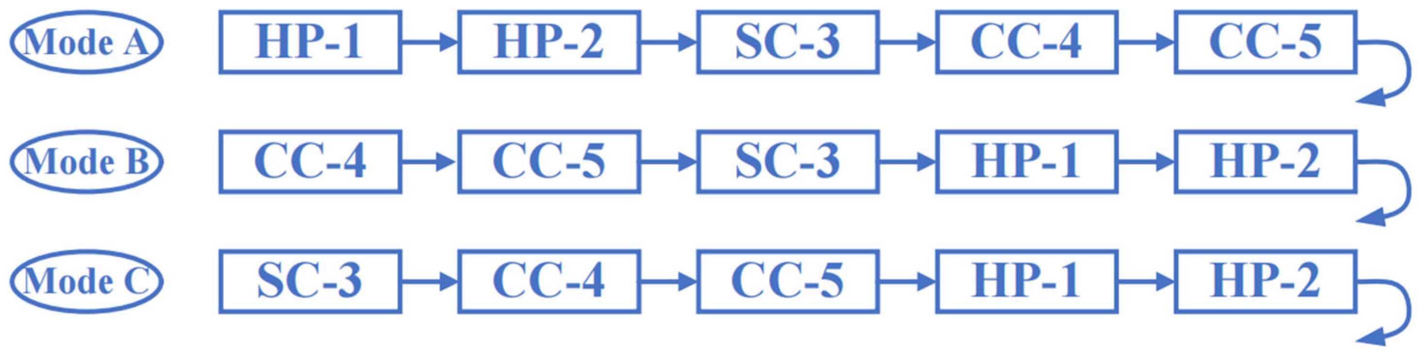 The control logic for Mode B is based on sequential activation of chiller units in response to varying cooling loads. The strategy segments load demand into five intervals, each corresponding to a distinct combination of operating units. The objective is to optimize energy efficiency while ensuring sufficient cooling capacity under varying load conditions.