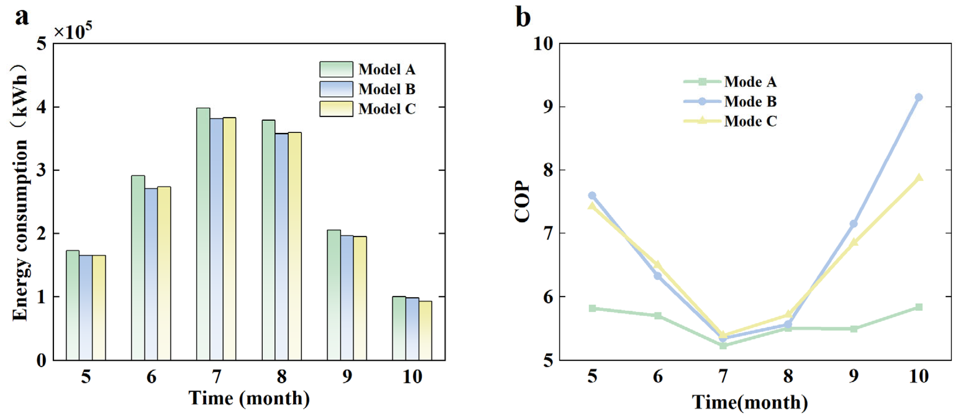 Figure 8, it can be seen that monthly analysis reveals that the energy consumption differences between Mode B and Mode C remain minimal from May to August. During this period, both strategies exhibit stable system performance. However, in September and October, Mode B shows a clear advantage. Notably, the system COP under Mode B reaches a peak value of 9.15 in October.