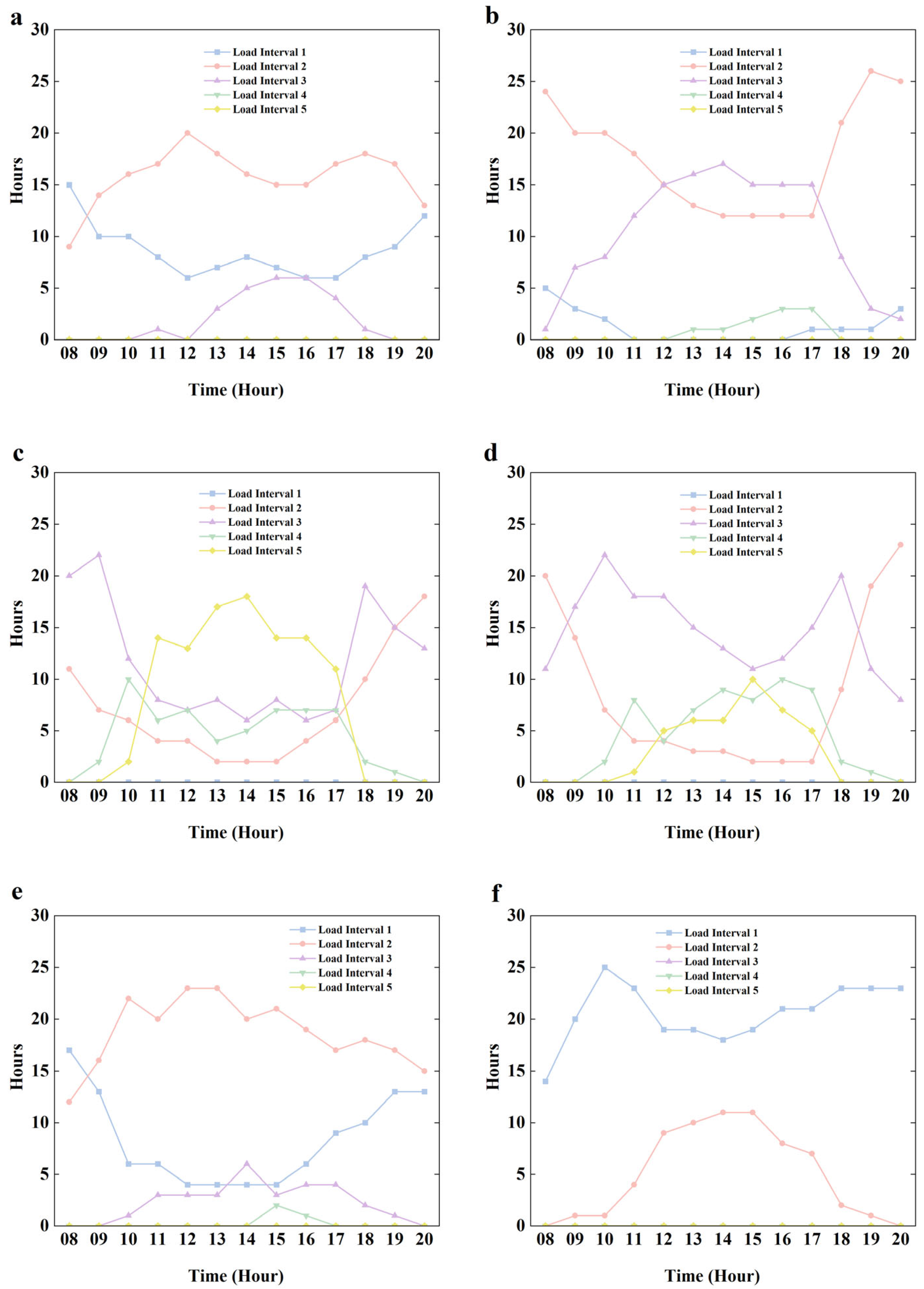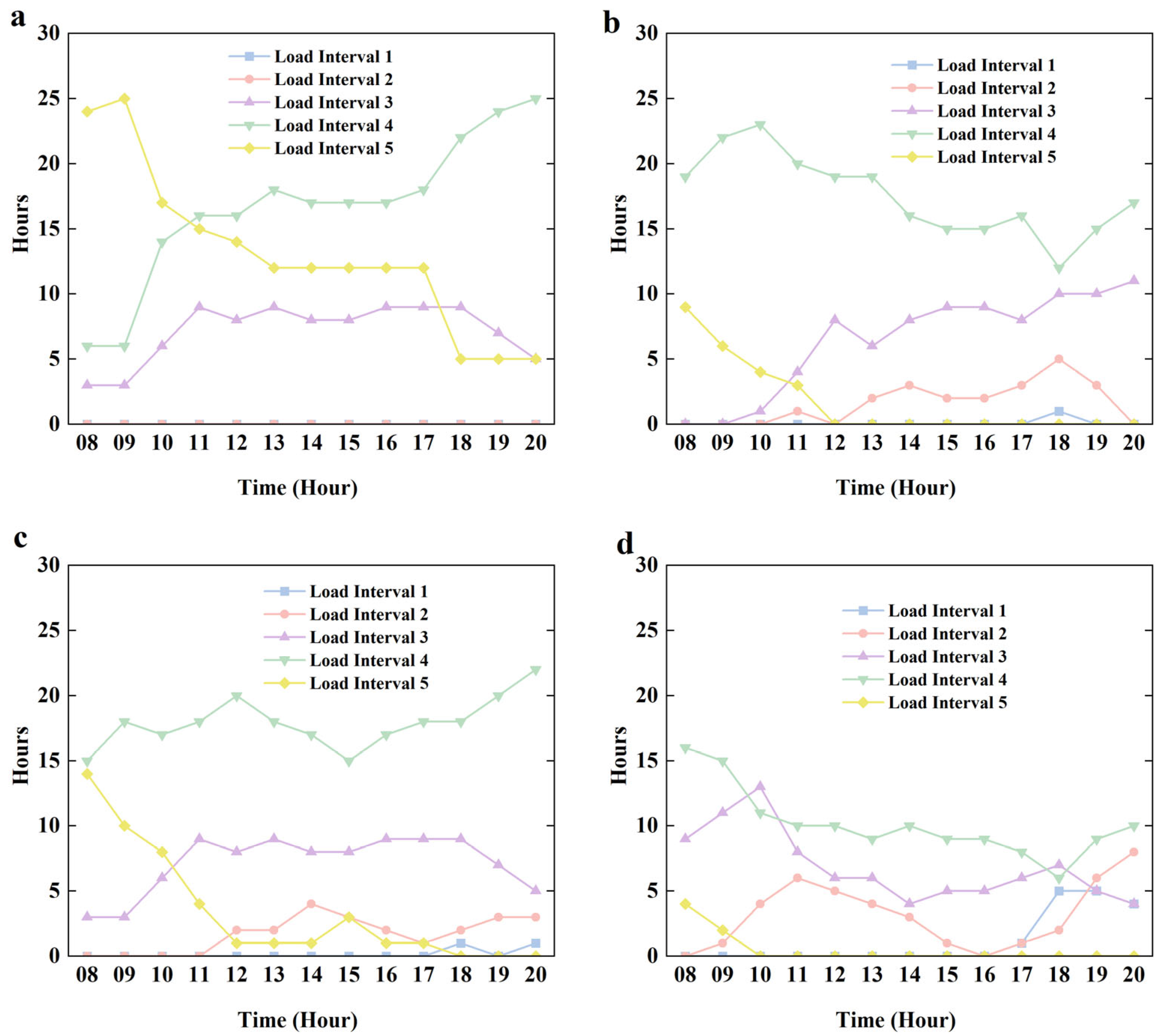 In August, Load Interval 2 was active for 112 h, with hourly peaks at 08:00 and again between 19:00 and 20:00. Load Interval 3 recorded 191 h, peaking from 09:00 to 19:00. Therefore, in August, Units CC-4 and CC-5 will be started from 8:00 to 9:00, Units SC-3, CC-4, and CC-5 will be started from 9:00 to 19:00, Units CC-4 and CC-5 will be started from 19:00 to 20:00.