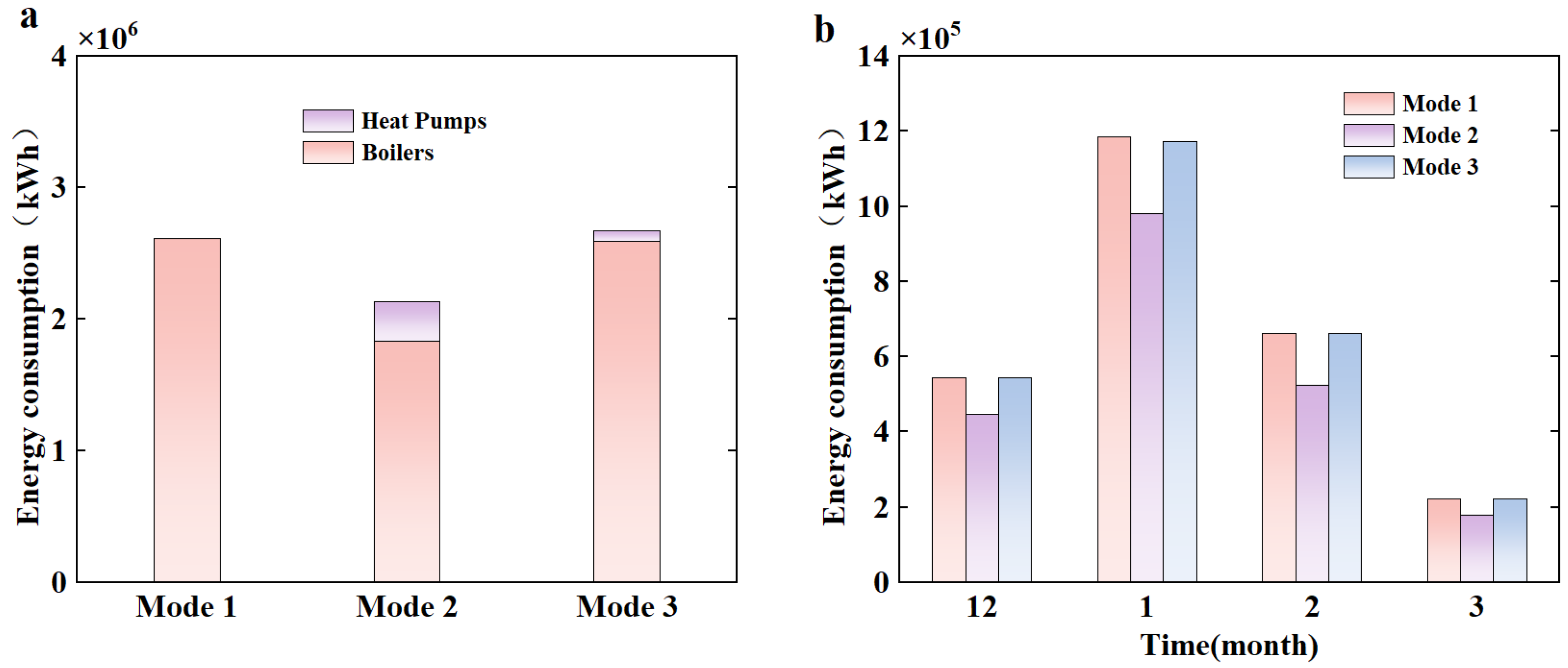 Figure 10. Mode 1, which relies solely on gas boilers, exhibits the highest total energy use at 2,612,813.21 kWh. Mode 2 integrates both gas boilers and air-source heat pumps. It achieves the lowest total energy consumption of 2,127,935.94 kWh, including 1,833,401.84 kWh from gas boilers and 294,434.10 kWh from heat pumps. Mode 3, where gas boilers are prioritized and heat pumps serve as supplementary units, results in 2,599,849.45 kWh total consumption, with 2,593,499.05 kWh from boilers and only 6350.40 kWh from heat pumps. Mode 2 demonstrates the most energy-efficient performance, achieving savings of approximately 484,877.27 kWh compared to Mode 1 and 47,191,351 kWh compared to Mode 3. This confirms the effectiveness of employing heat pumps as base-load units to reduce overall system energy use.