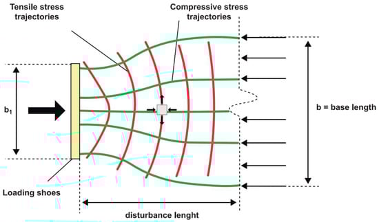 Another alternative approach used to predict splitting phenomena in concrete specimens is presented by He and Liu []. In this case, the prediction is based on compression-dispersion models, in which the load paths are mathematically visualized by infinite isostatic lines with their own geometric and physical boundary conditions.
